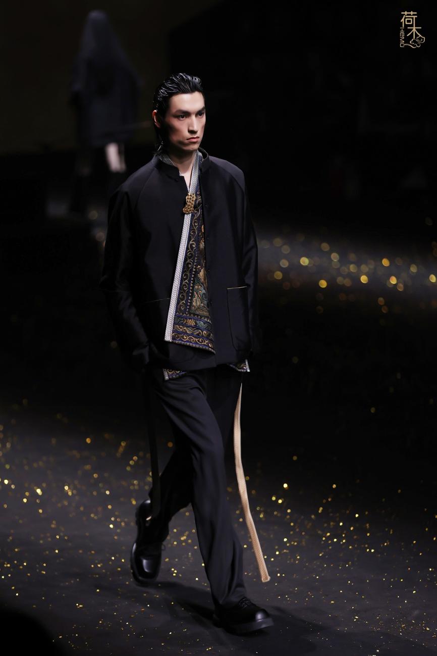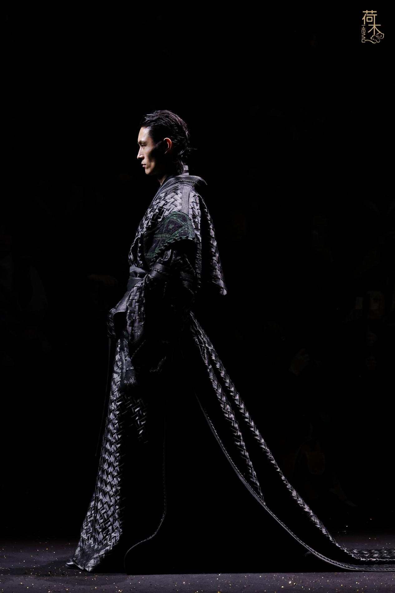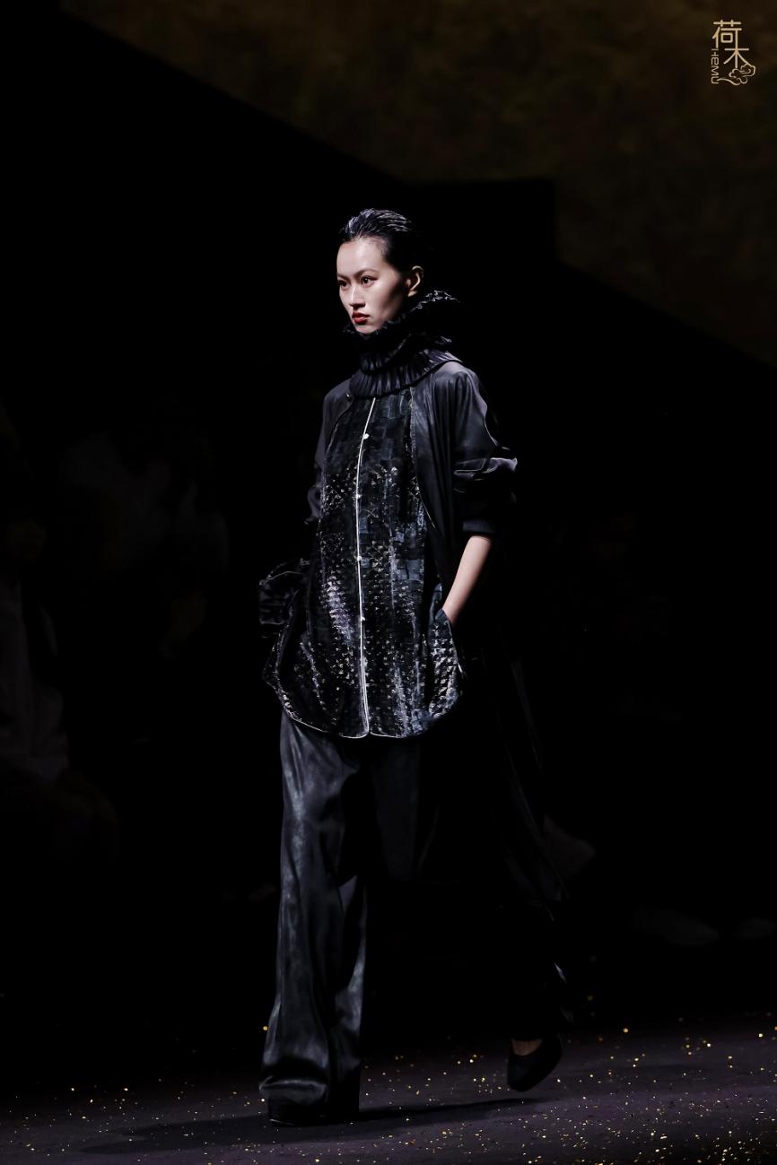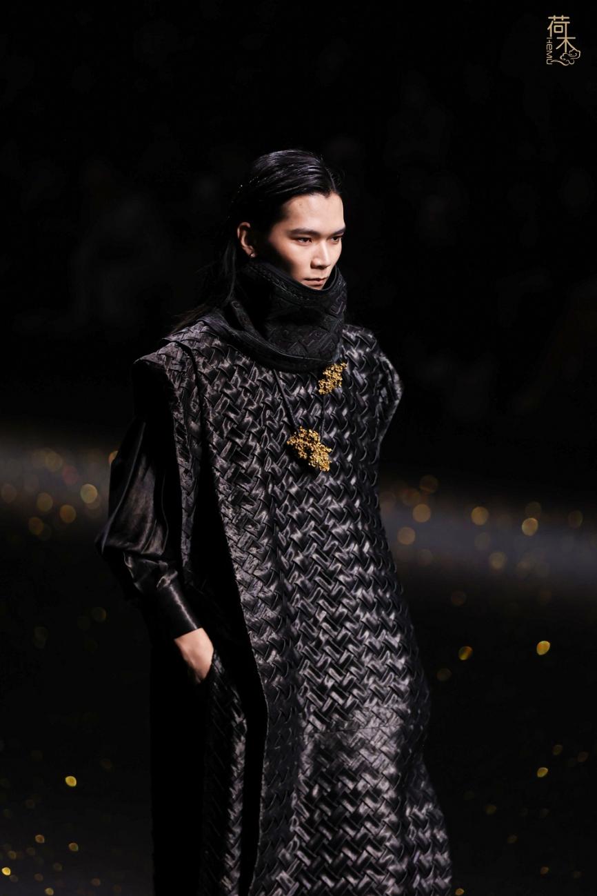 荷木HEMU2026AW「楚歌」系列作品延续了往季的设计风格:东方、极简、当代。面料采用香云纱、织锦、 宋锦、蜀锦、苏绣、苗绣等中国传统非遗织造和染整、刺绣技艺;图案设计以楚地经典纹样为创作灵感, 结合当代时尚语境重新解构重组,让千年楚韵焕发新生;主色系采用青铜器的漆古之美,表达了东方最 沉敛高贵的色彩美学。