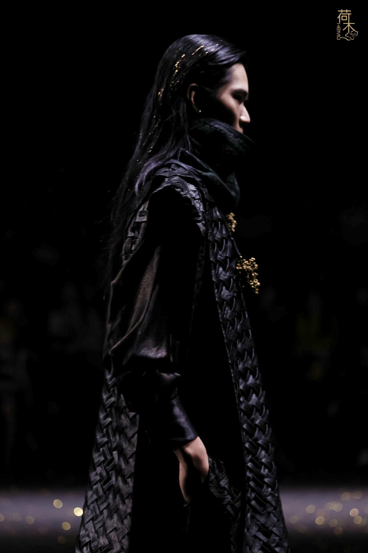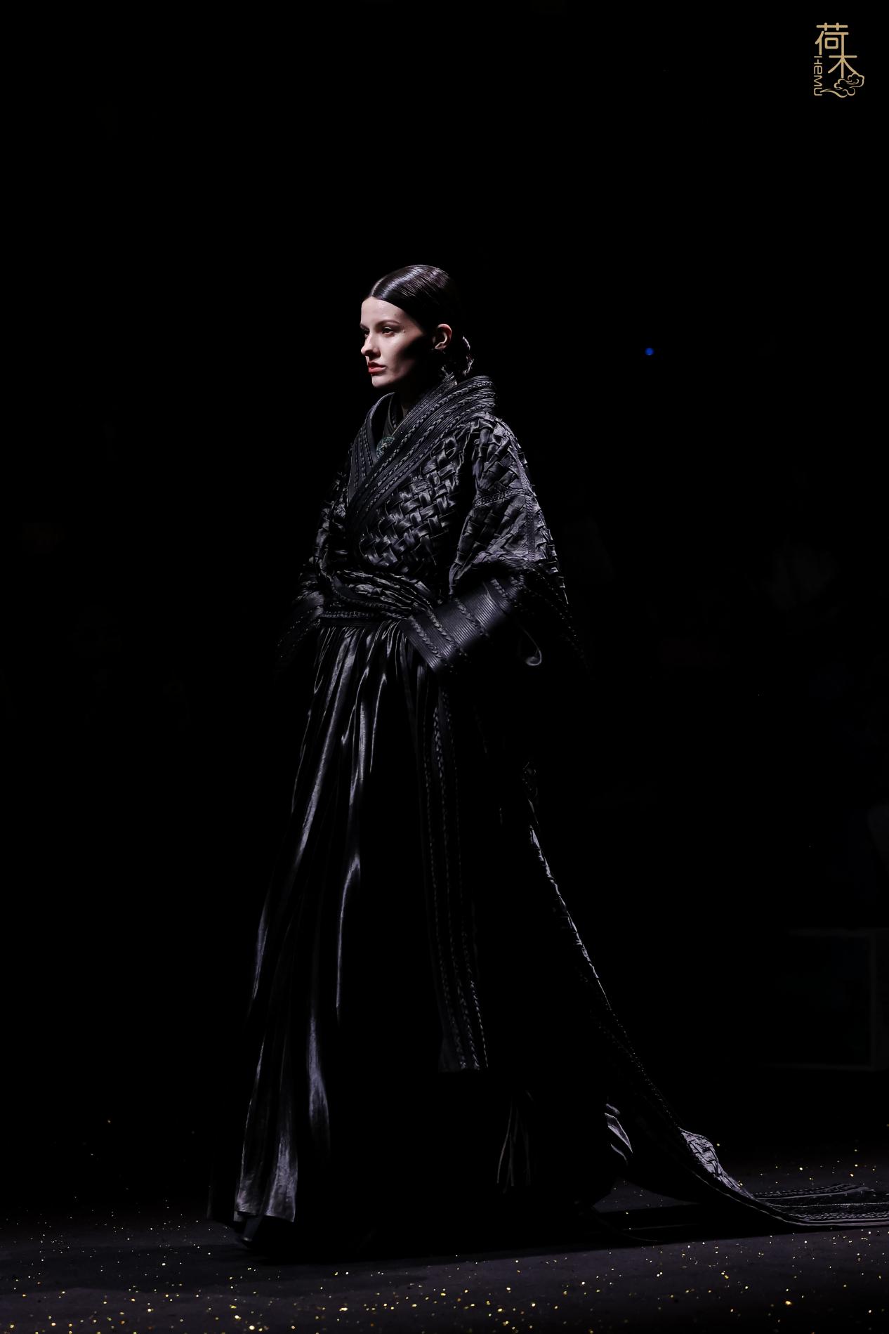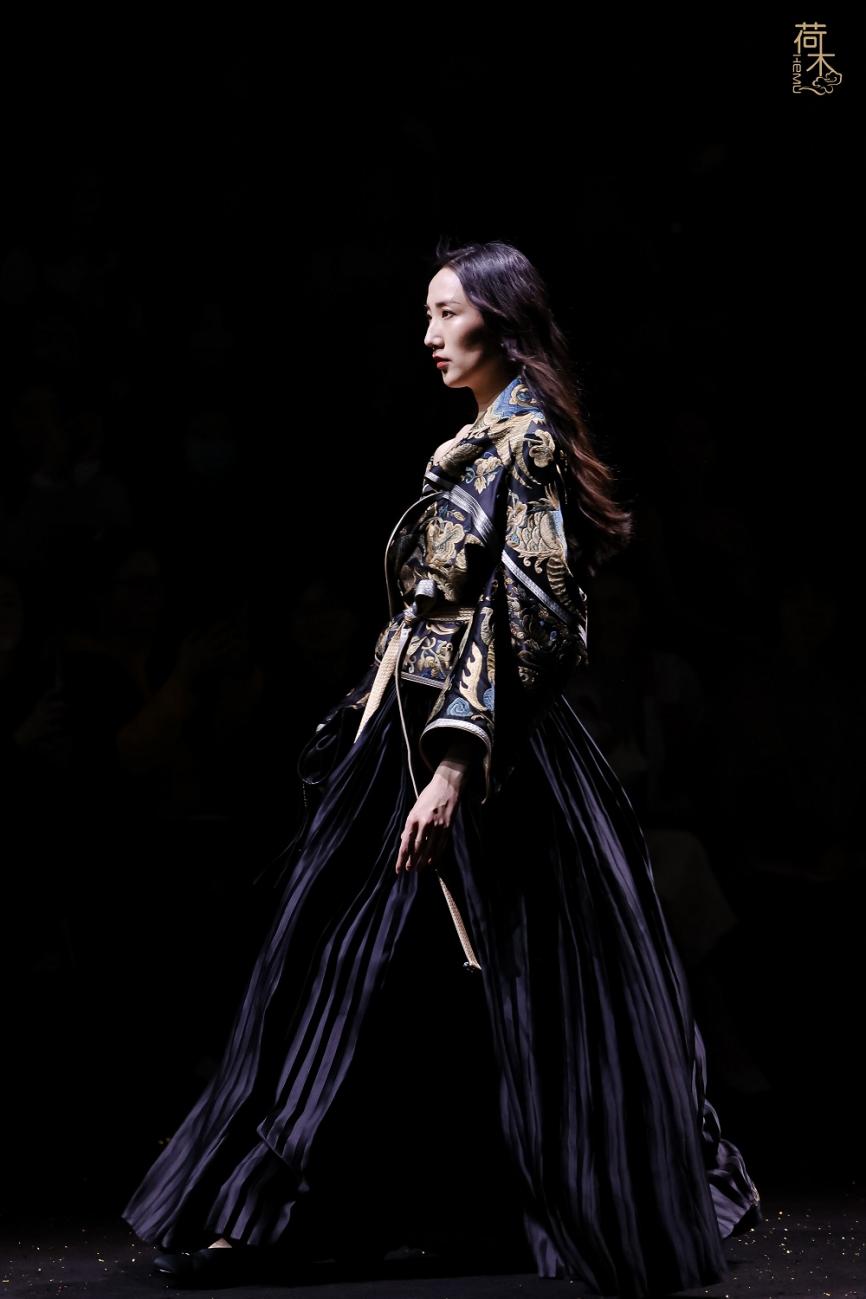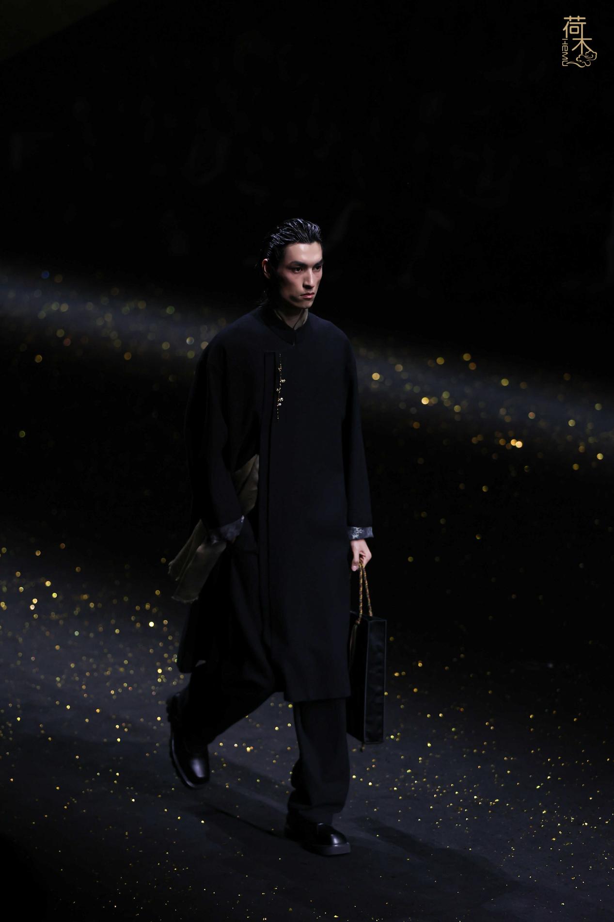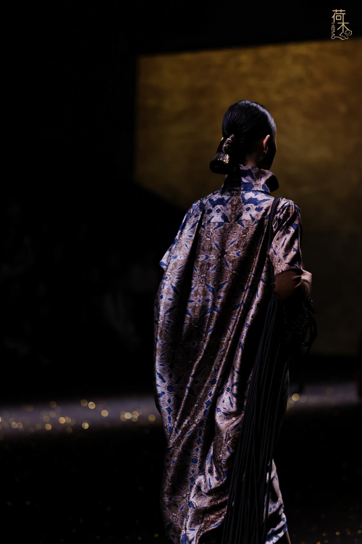 荷木HEMU2026AW「楚歌」系列作品延续了往季的设计风格:东方、极简、当代。面料采用香云纱、织锦、 宋锦、蜀锦、苏绣、苗绣等中国传统非遗织造和染整、刺绣技艺;图案设计以楚地经典纹样为创作灵感, 结合当代时尚语境重新解构重组,让千年楚韵焕发新生;主色系采用青铜器的漆古之美,表达了东方最 沉敛高贵的色彩美学。