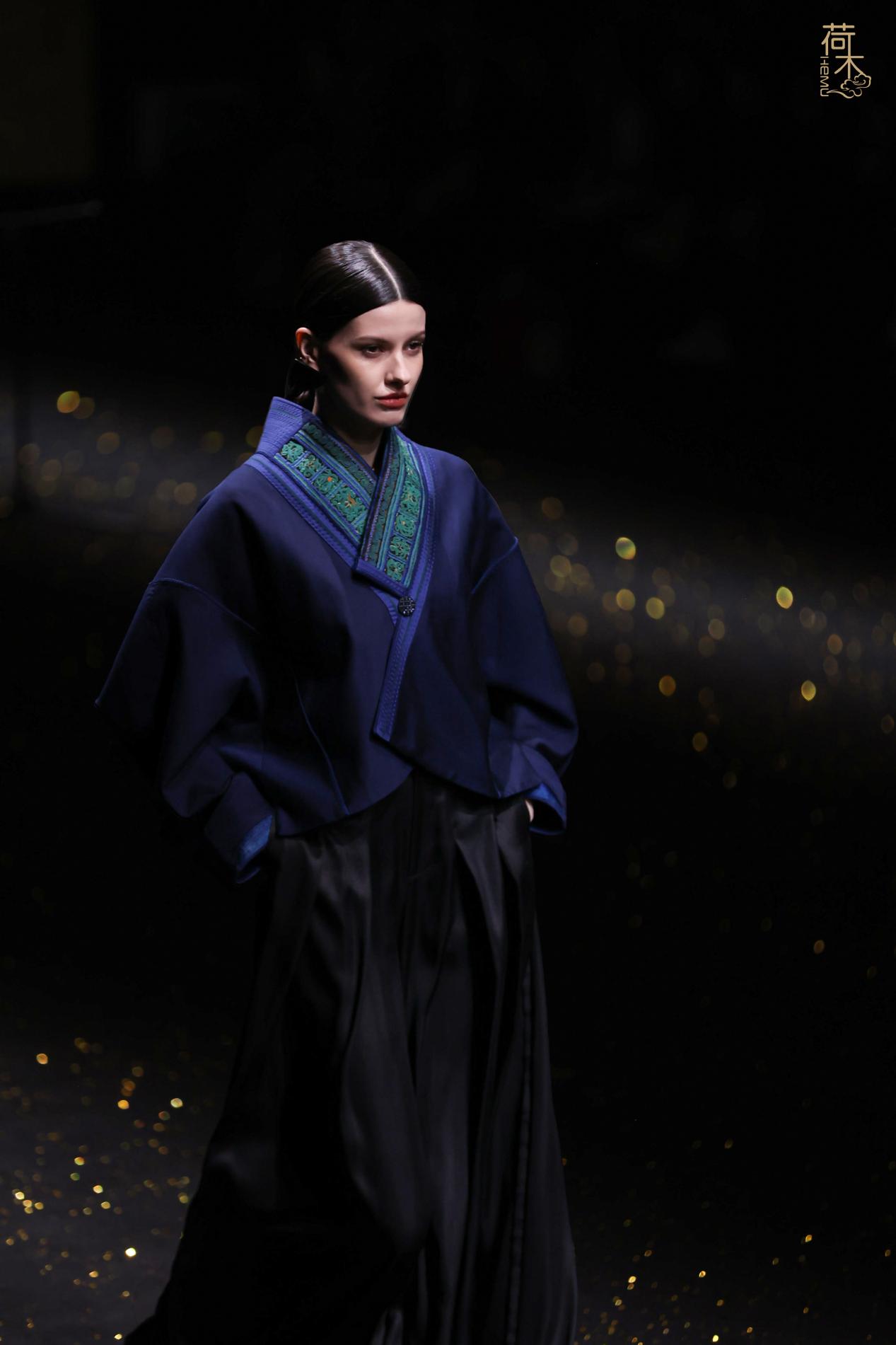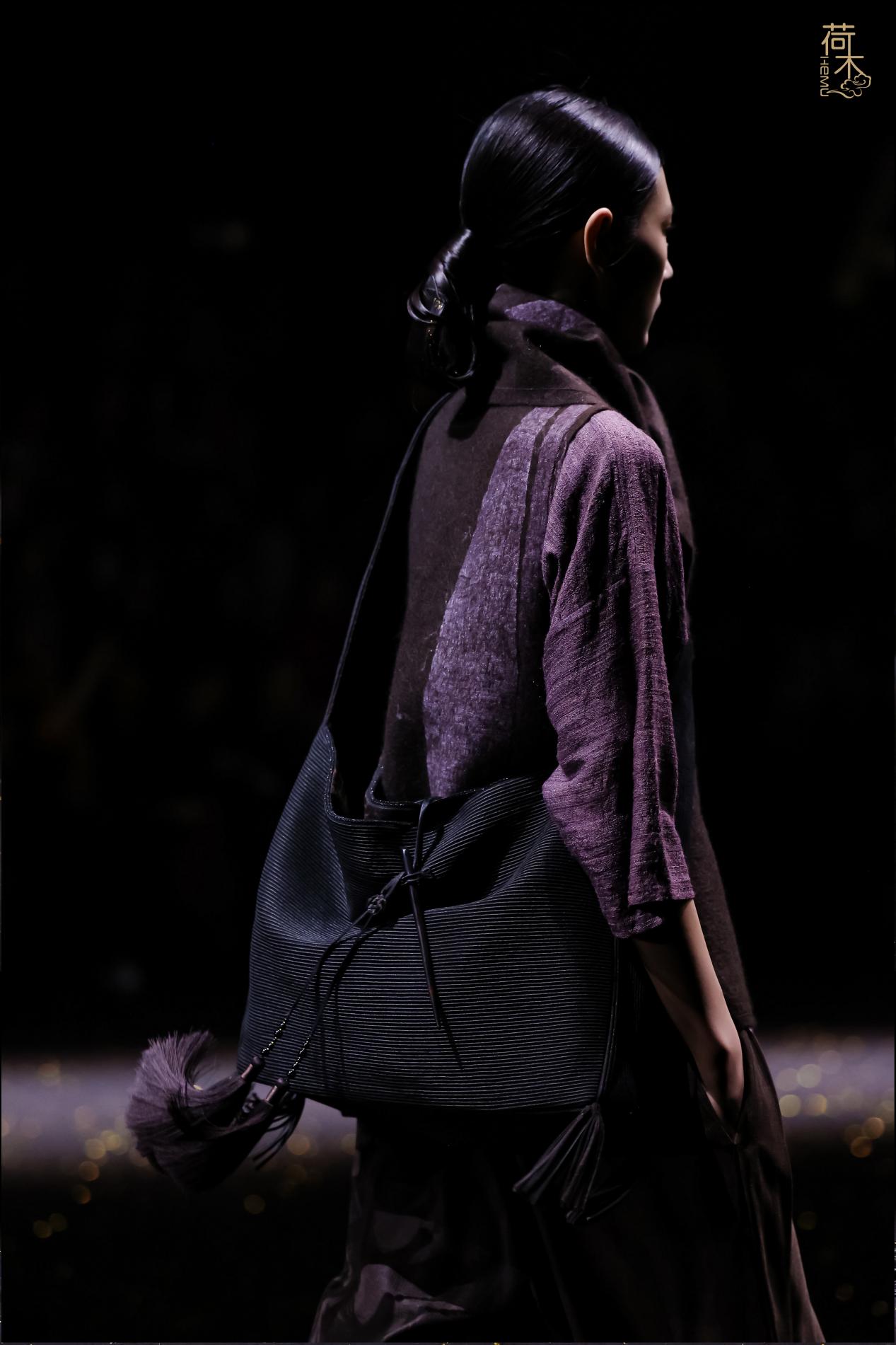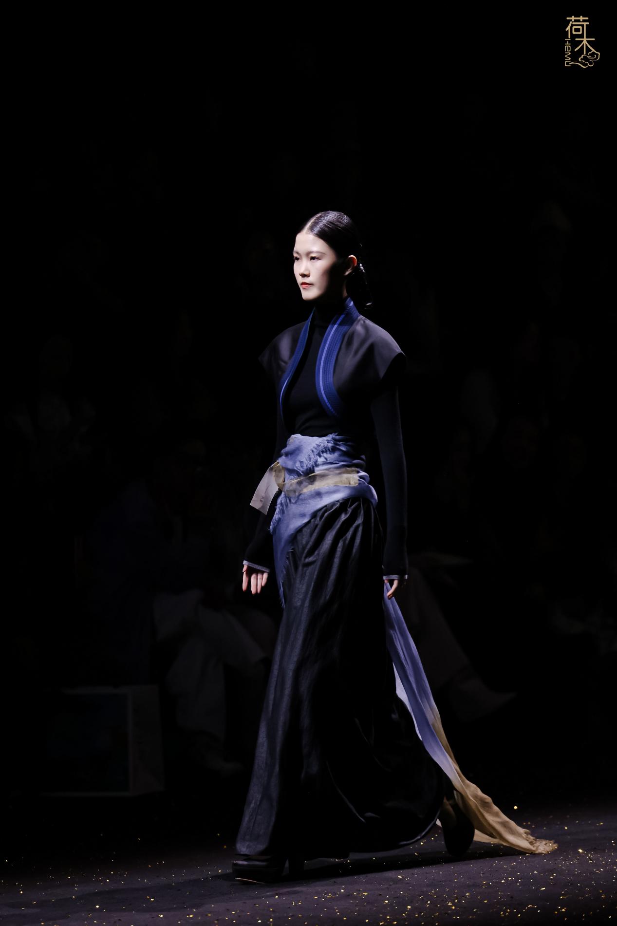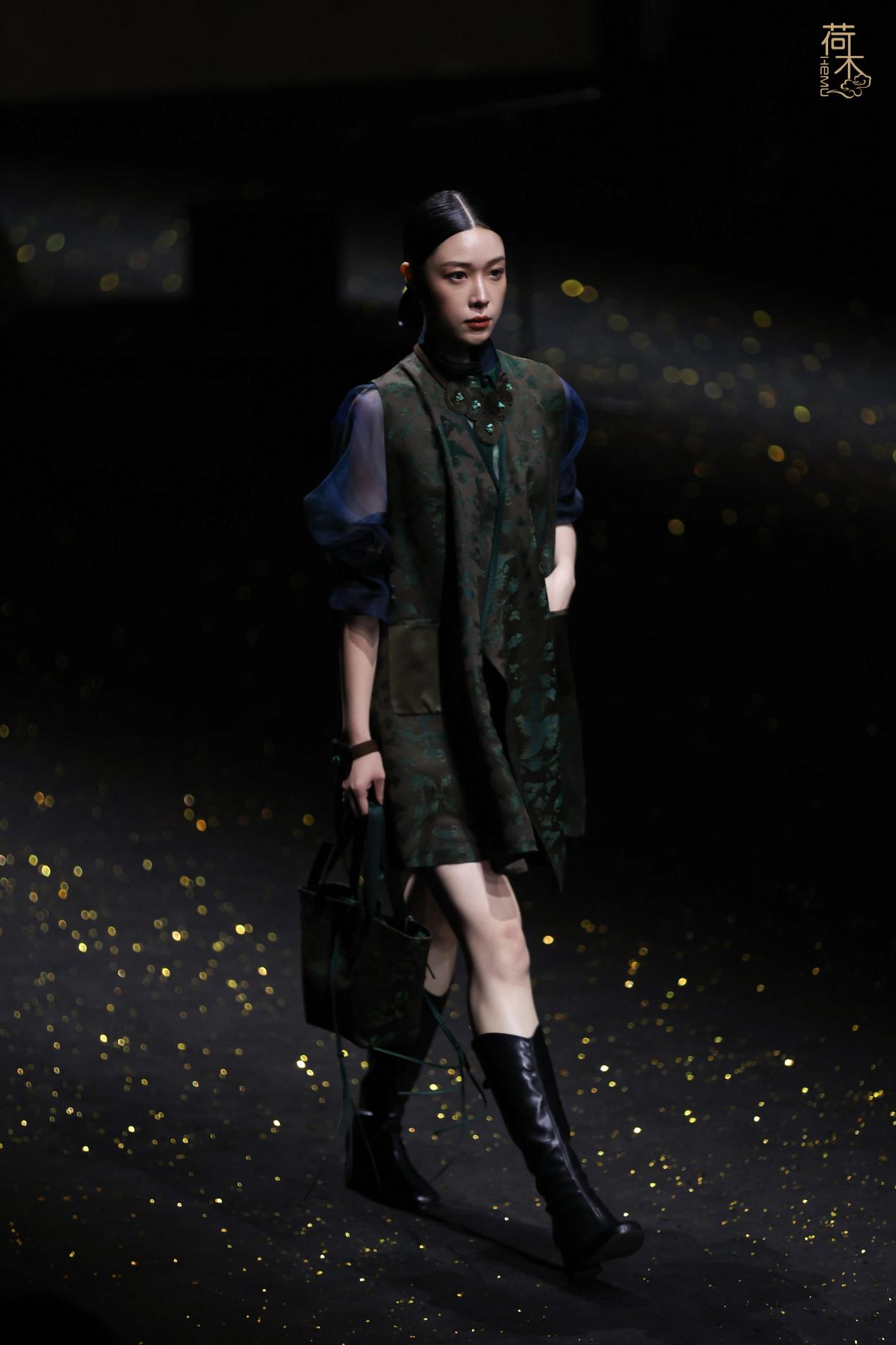 荷木HEMU2026AW「楚歌」系列作品延续了往季的设计风格:东方、极简、当代。面料采用香云纱、织锦、 宋锦、蜀锦、苏绣、苗绣等中国传统非遗织造和染整、刺绣技艺;图案设计以楚地经典纹样为创作灵感, 结合当代时尚语境重新解构重组,让千年楚韵焕发新生;主色系采用青铜器的漆古之美,表达了东方最 沉敛高贵的色彩美学。