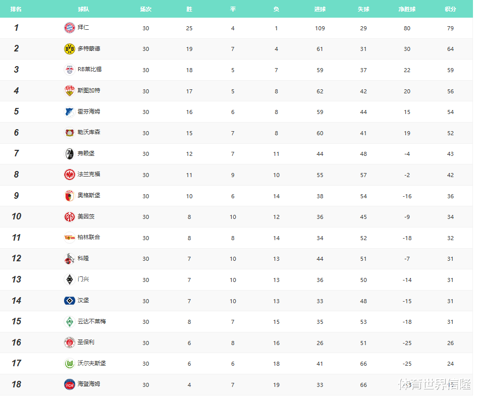 本轮拜仁4-2逆转斯图加特,而排名第二的多特蒙德客场1-2输给霍芬海姆,德甲还剩4轮,拜仁已经领先多特15分,提前夺冠。