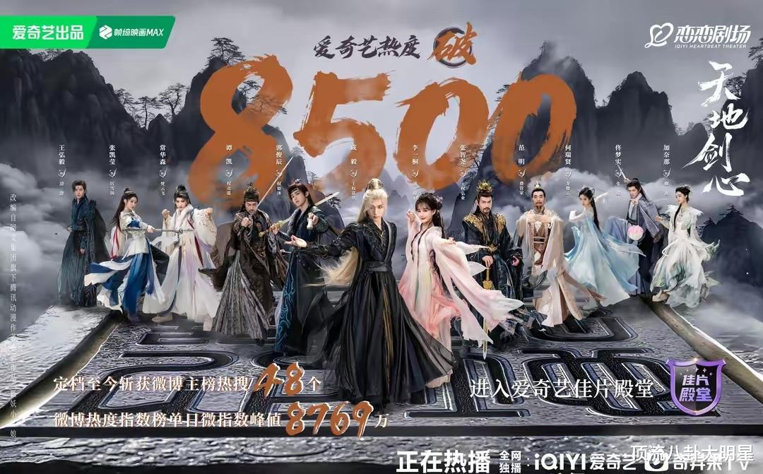 《天地剑心》2025年首播就成为爱奇艺年冠,热度首日达8100,次日破8900,成毅饰演的“王权富贵”单日角色热度已破达7亿,累计播放量1.2亿。