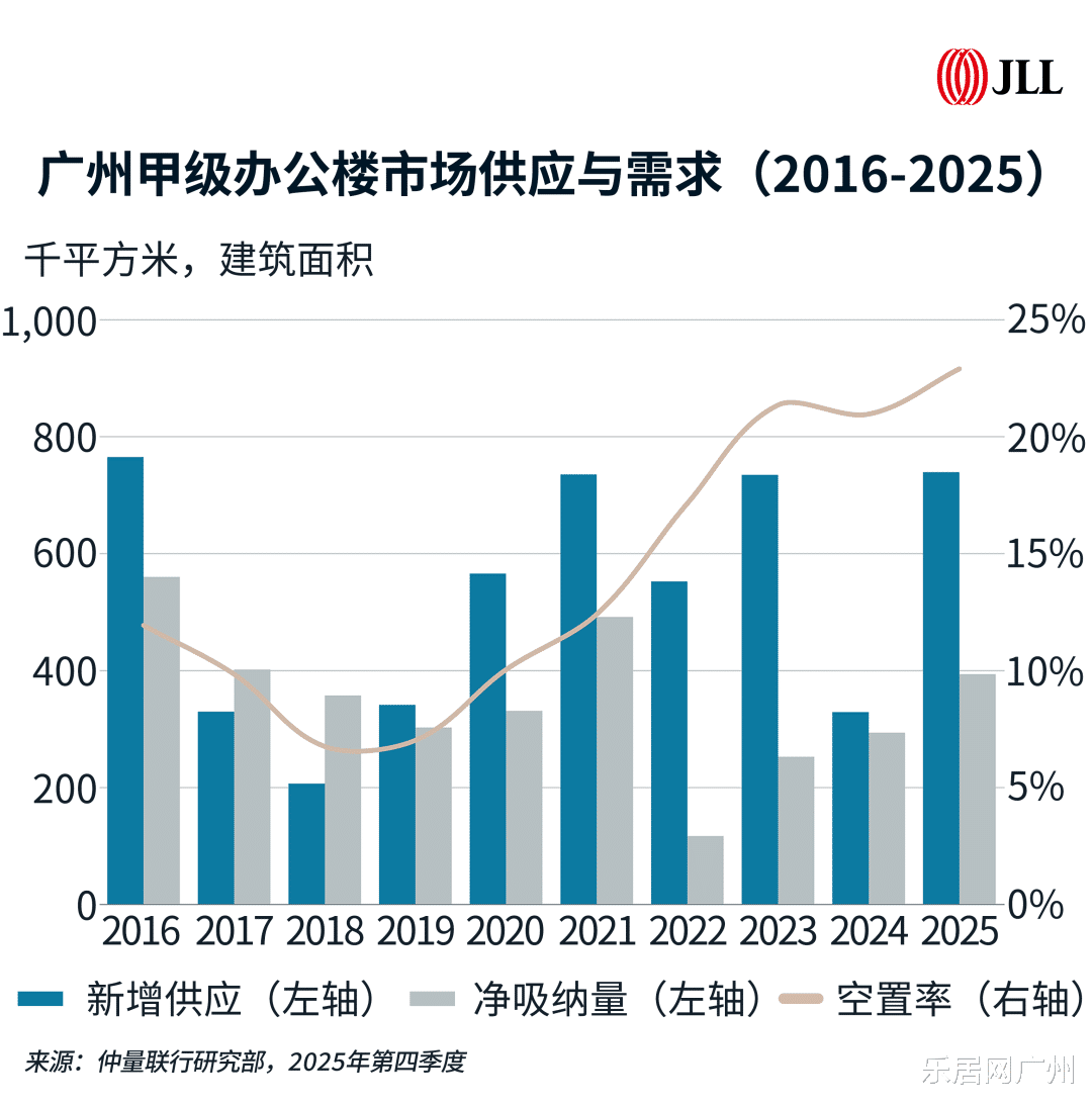 截至2025年末,广州甲级写字楼平均空置率为22.9%,同比上升2个百分点。(数据来源:仲量联行)
