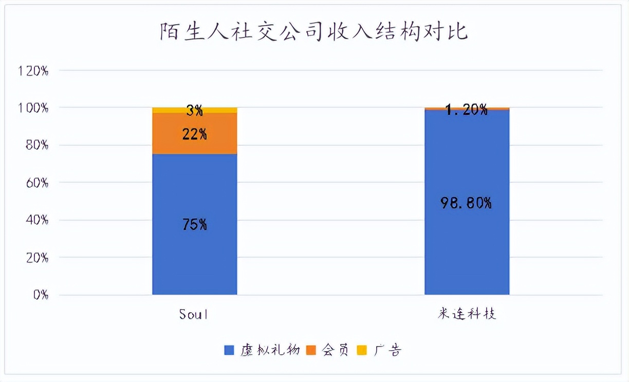 但对于陌生人社交赛道而言,由于流量规模有限、用户留存难度大,平台更多选择变现效率更高的会员、虚拟礼物业务。例如,Soul的收入结构中,虚拟礼物收入占比达75%,会员收入占比22%,广告收入占比则不足3%。