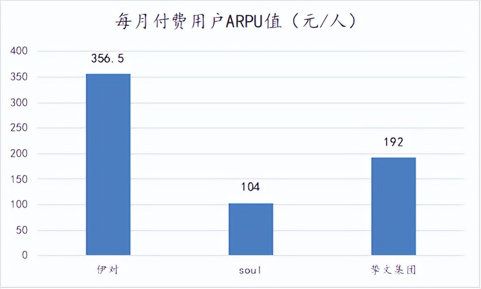 在主流陌生人社交软件中,伊对的每月付费用户ARPU值高达356.5元/人,远超Soul的104元/人,也大幅高于陌陌、探探母公司挚文集团的192元/人。
