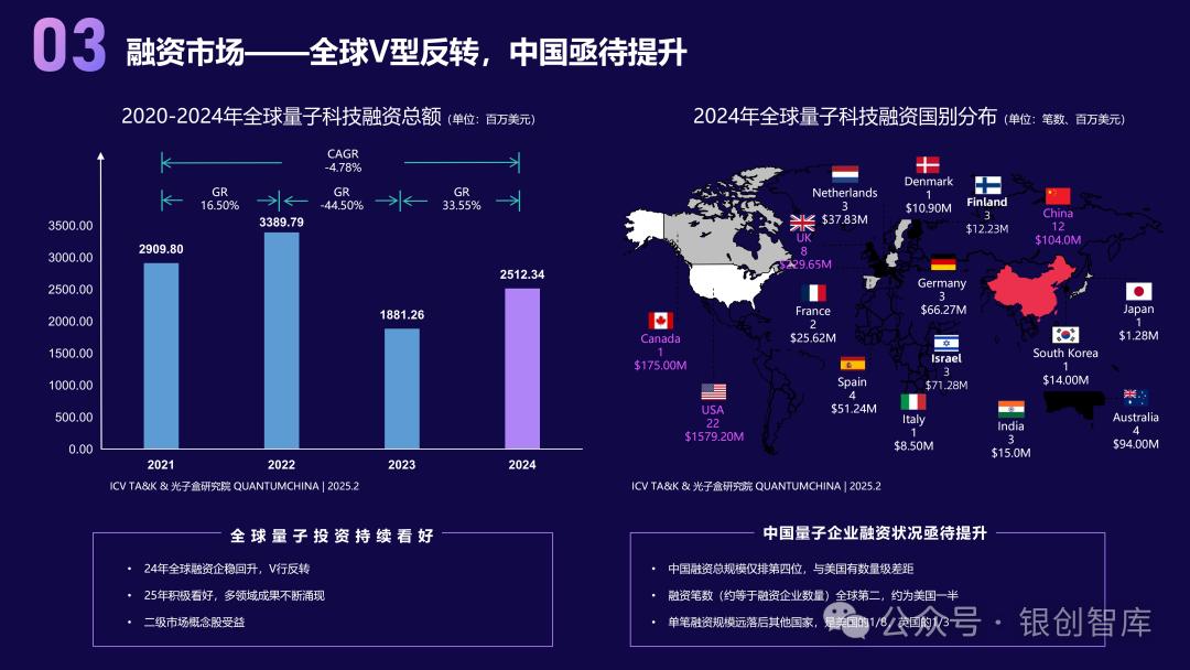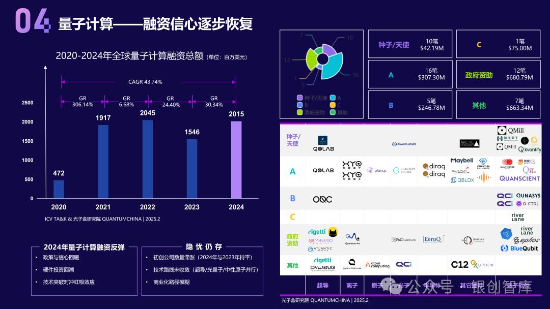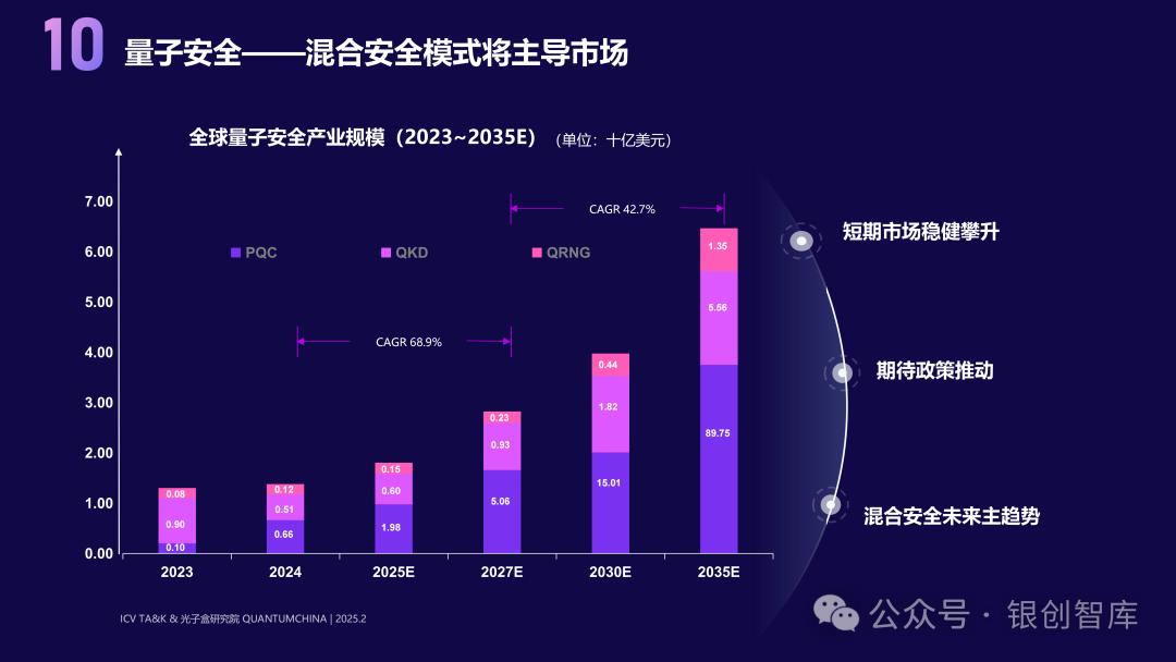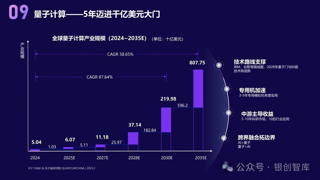 从全球产业生态来看,量子核心企业总数已近千家,中美两国以合计超50%的占比形成双强主导格局,上游企业规模达428家,中游软硬件厂商成为产业核心力量。融资市场在2024年实现V型反转,全球投资信心回暖,量子计算融资反弹、量子传感持续向好,而量子安全领域仍面临技术迭代与市场竞争的双重挑战。作为兼具前沿性与战略性的新兴产业,量子科技已从概念验证与量子优越性展示阶段,稳步迈入含噪声中等规模量子(NISQ)时代的应用探索期,2025年全球产业规模有望突破百亿美元,2035年更将向万亿规模迈进。