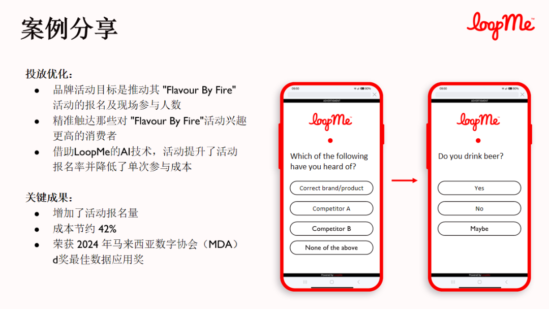 这里为大家分享一个实际投放案例,我们为“Flavour By Fire”打造的品牌营销活动。通过定向发放目标用户问卷,结合独立AI投放技术,我们不仅显著提升了活动报名率,还降低了42%的成本,助力"Flavour By Fire"实现了显著的业绩增长。该案例也荣获了《2024年马来西亚数字协会(MDA)d奖最佳数据应用奖》。
