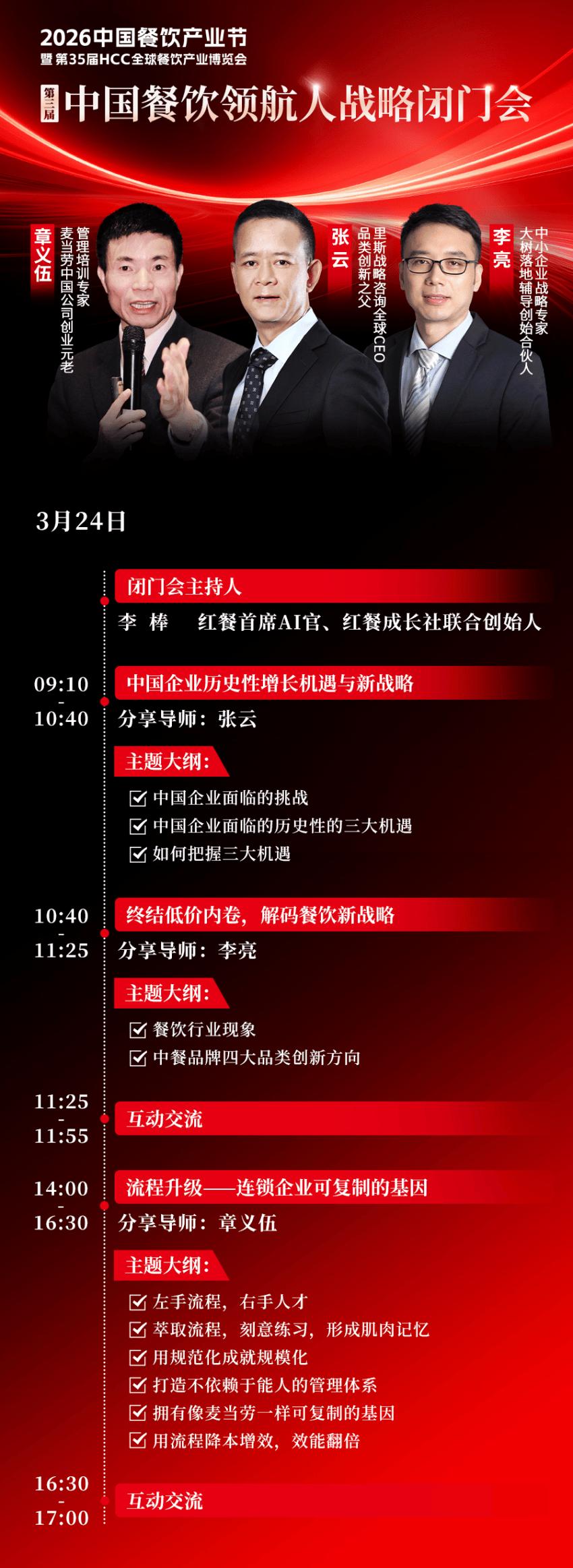 第三届中国餐饮领航人战略闭门会 作为本届产业节的重磅板块,“第三届中国餐饮领航人战略闭门会”定于3月24日隆重举行,特邀品类创新之父、里斯战略咨询全球CEO张云、麦当劳中国公司创业元老章义伍、大树落地辅导创始合伙人、中小企业战略专家李亮,结合实战经验进行分享,助力餐饮企业应对挑战。同时定向邀请150位优秀餐饮连锁企业掌门人进行深度学习与交流。