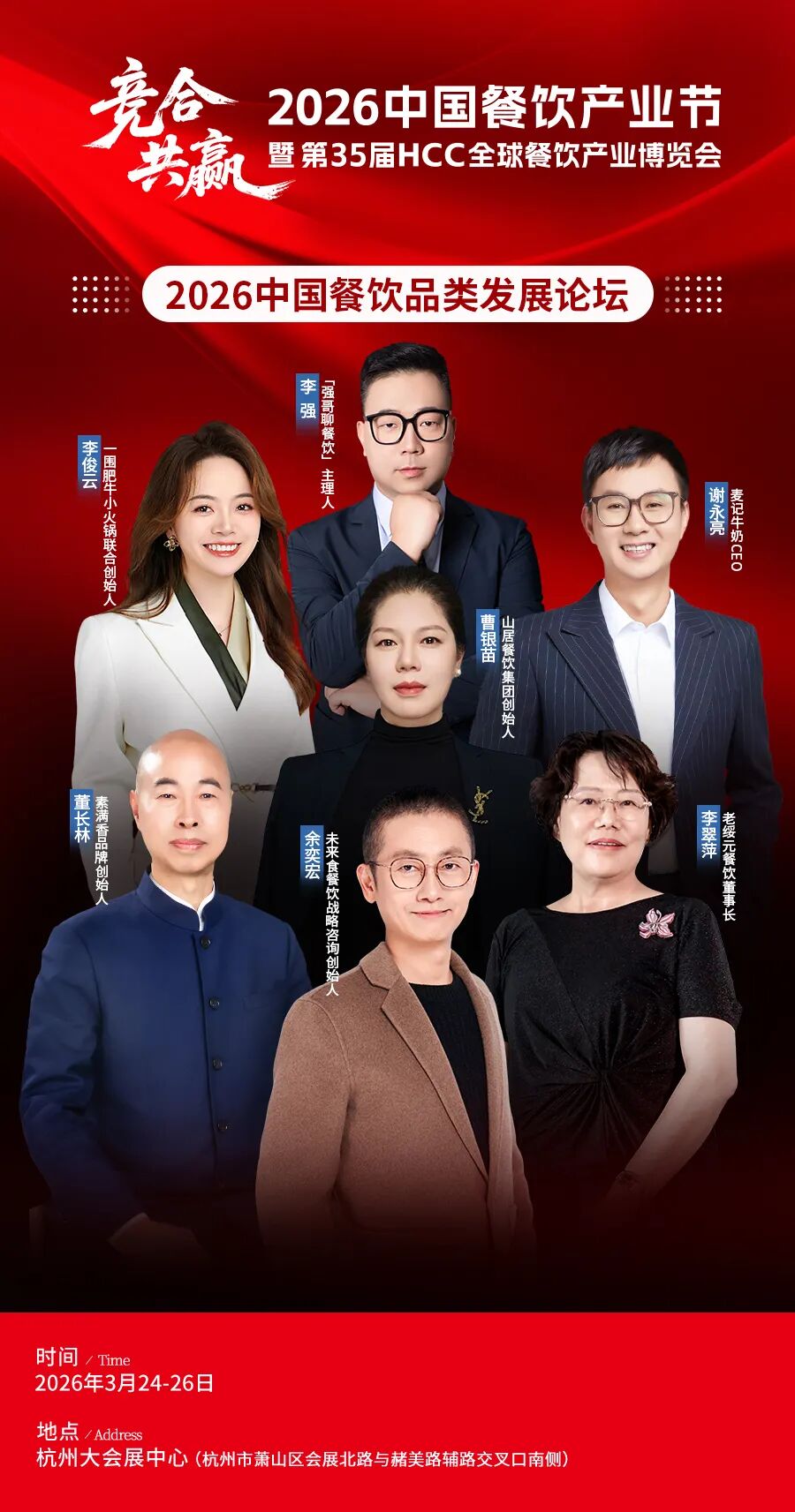在此背景下,2026中国餐饮产业节暨第35届HCC全球餐饮产业博览会应运而生。本届产业节由世界中餐业联合会、红餐网联合主办,以“竞合·共赢”为主题,将于3月24-26日在杭州大会展中心举办。