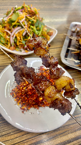 东北烤肉真的好吃!大肉串是平时吃的肉串plus版,炭火烤的,肥的地方油香焦脆,料撒的很足!肉类推荐大片肉、拌牛肉、安格斯牛胸口都好好吃~