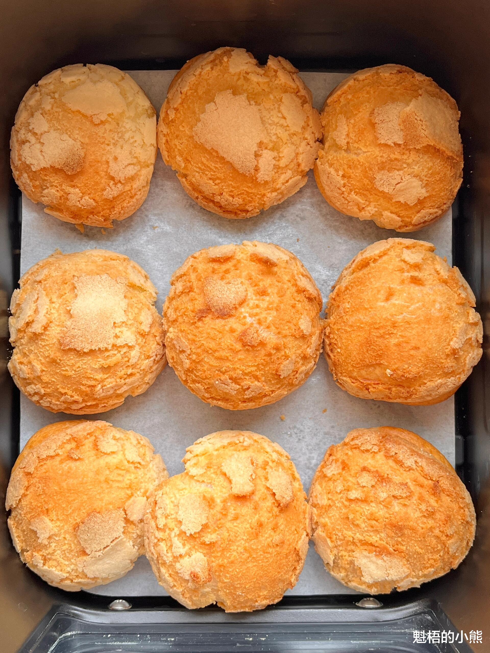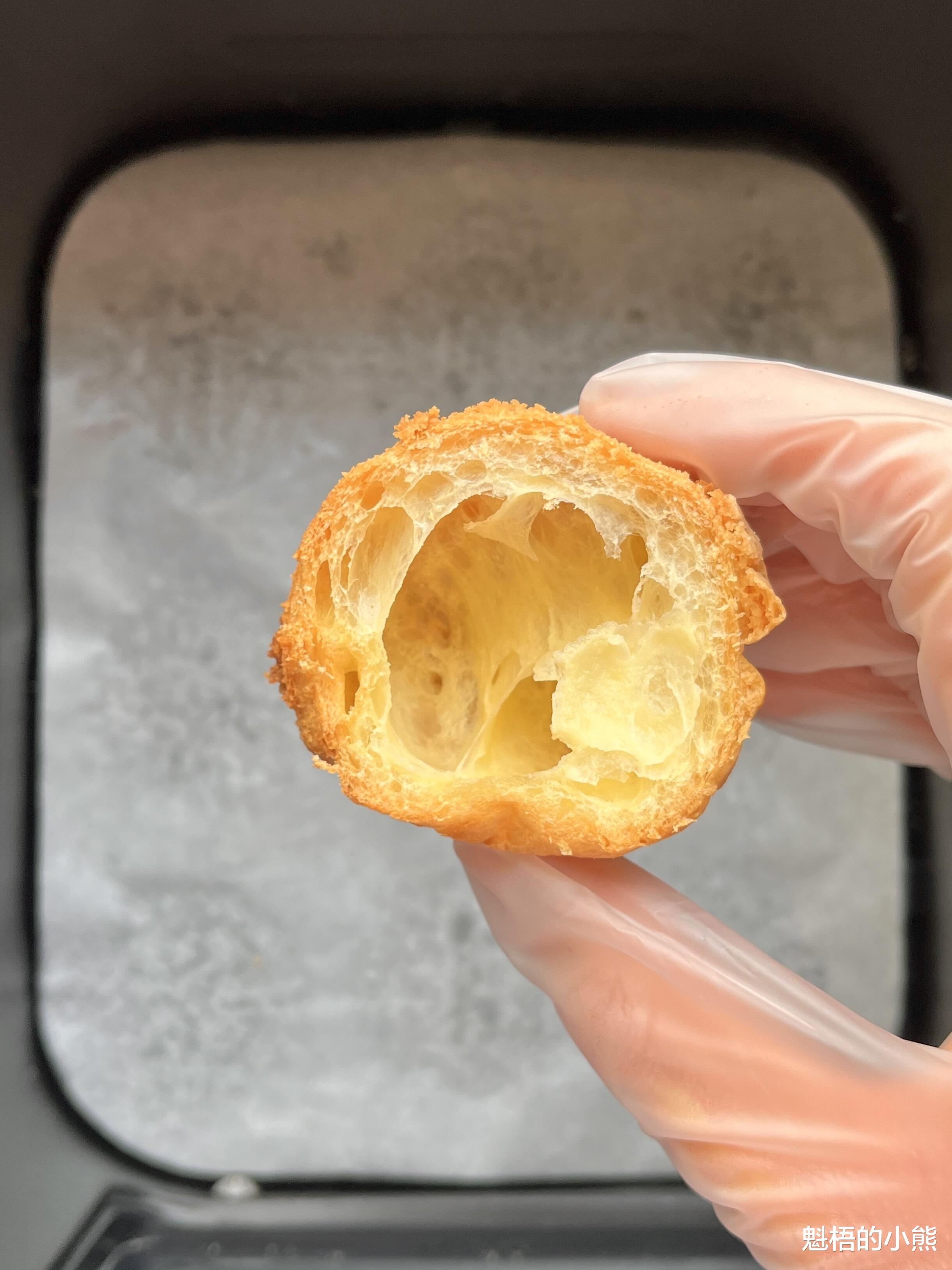 把炸篮推进空气炸锅,设置180度,先烤18分钟。注意,中途绝对不要打开抽屉看,冷空气进去会让泡芙回缩——你辛苦做好的“小胖子”会瞬间变成“小老头”。18分钟后,拉出炸篮,你会看到泡芙已经鼓得高高的,表面金黄,像一个个圆滚滚的小球,轻轻一碰能听到空心的回声。这时候快速给每个泡芙翻个面,再推进去烤7分钟。这一步是为了让底部也上色变脆,保证整个泡芙都是酥脆的,从头顶到底部都金灿灿。