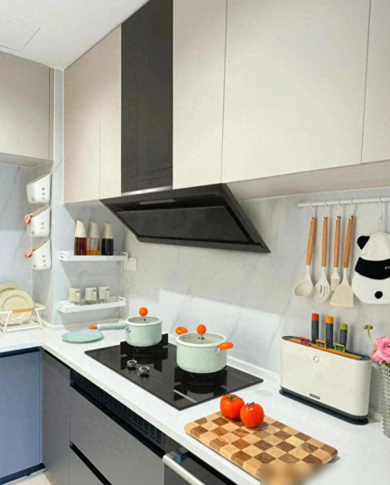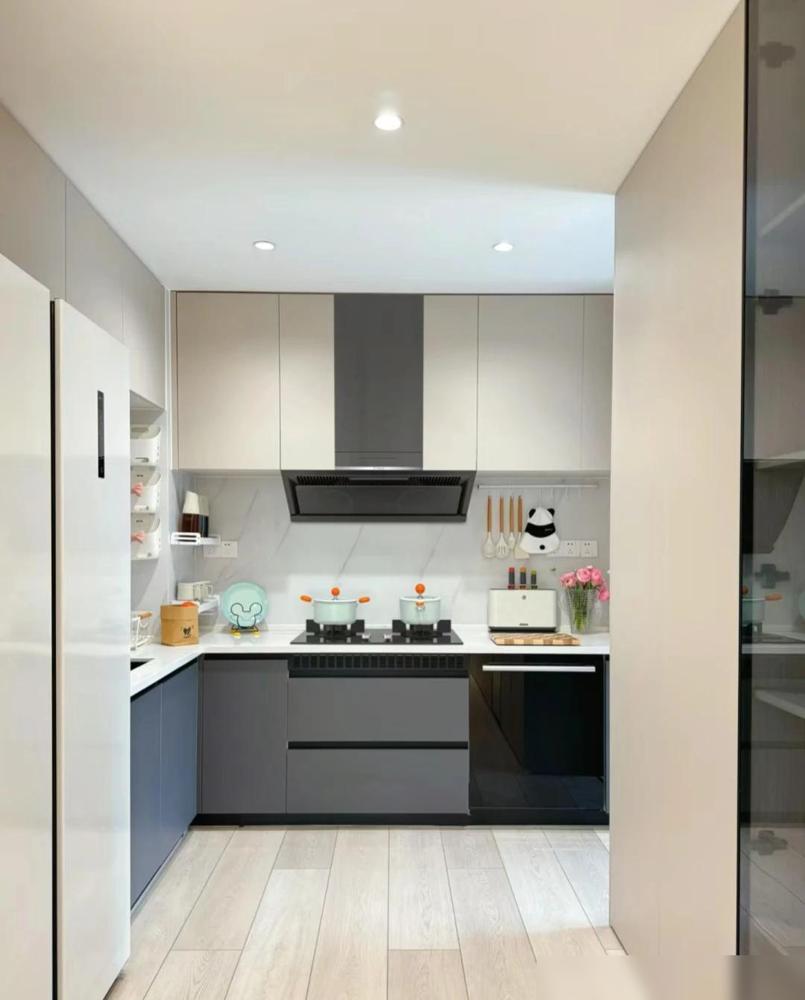 餐厅的岩板餐桌确实耐用好打理。亚克力餐椅通透感强,不占空间。餐边柜容量大很重要,杂七杂八的小家电都能收进去。厨房做成U型布局,操作动线合理,两个人同时在厨房也不会挤。