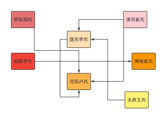 范阳卢氏的婚姻范围严格限定在清河崔氏、荥阳郑氏、赵郡李氏、陇西李氏四家,唐代才勉强增加了太原王氏和博陵崔氏两家。