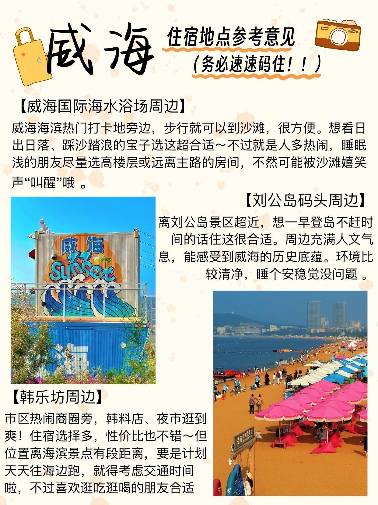 🏠住宿tips: 想看海住海水浴场🌅 想安静选刘公岛码头⛵️ 爱吃爱逛pick韩乐坊周边🍢