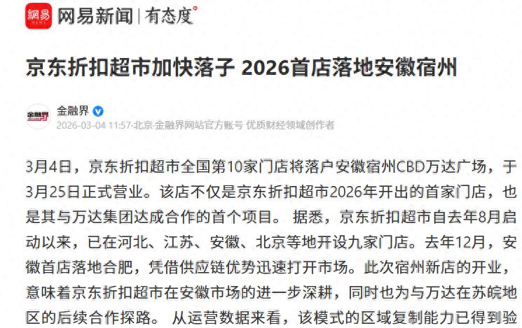 这既是其2026年首家新店,也是与万达集团合作的首个项目,业界普遍认为标志着京东折扣布局再进一步,推动了更多人关注这一火热赛道。