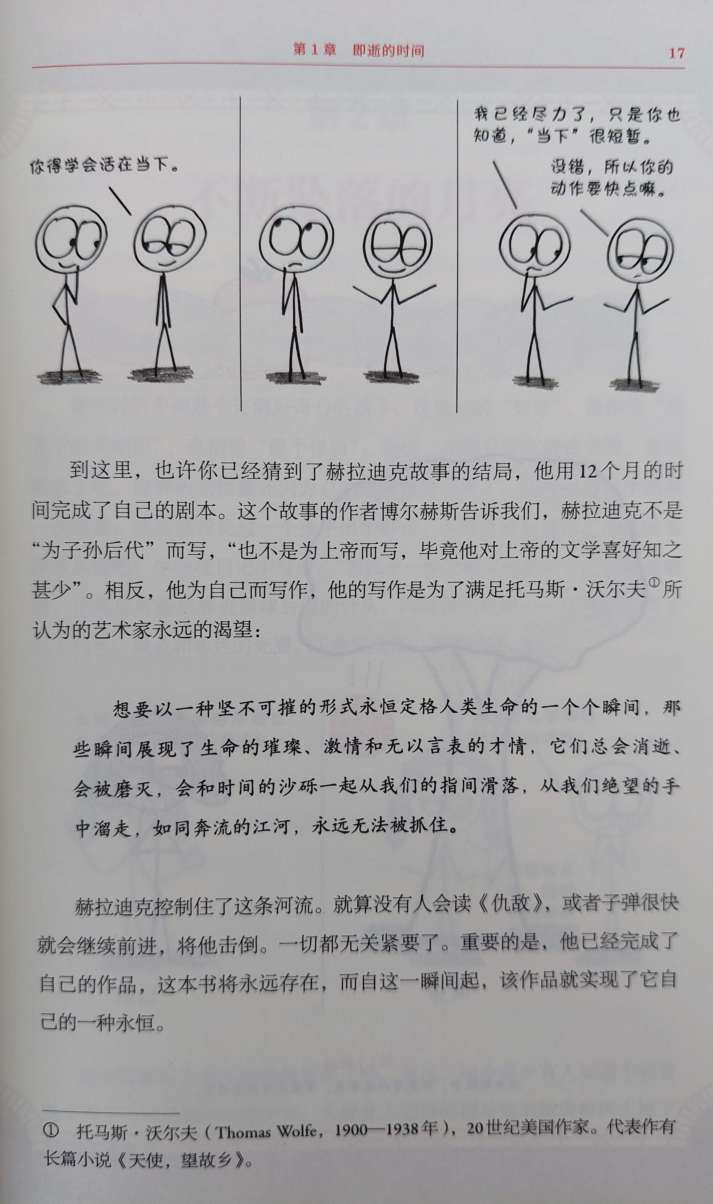 到这里,也许你已经猜到了赫拉迪克故事的结局,他用12个月的时间完成了自己的剧本。这个故事的作者博尔赫斯告诉我们,赫拉迪克不是“为子孙后代”而写,"也不是为上帝而写,毕竟他对上帝的文学喜好知之甚少”。相反,他为自己而写作,他的写作是为了满足托马斯·沃尔夫¹所认为的艺术家永远的渴望:想要以一种坚不可摧的形式永恒定格人类生命的一个个瞬间,那些瞬间展现了生命的璀璨、激情和无以言表的才情,它们总会消逝、会被磨灭,会和时间的沙砾一起从我们的指间滑落,从我们绝望的手中溜走,如同奔流的江河,永远无法被抓住。赫拉迪克控制住了这条河流。就算没有人会读《仇敌》,或者子弹很快就会继续前进,将他击倒。一切都无关紧要了。重要的是,他已经完成了自己的作品,这本书将永远存在,而自这一瞬间起,该作品就实现了它自己的一种永恒。注¹:托马斯·沃尔夫(Thomas Wolfe,19 00-19 38年),20世纪美国作家。代表作有长篇小说《天使,望故乡》。