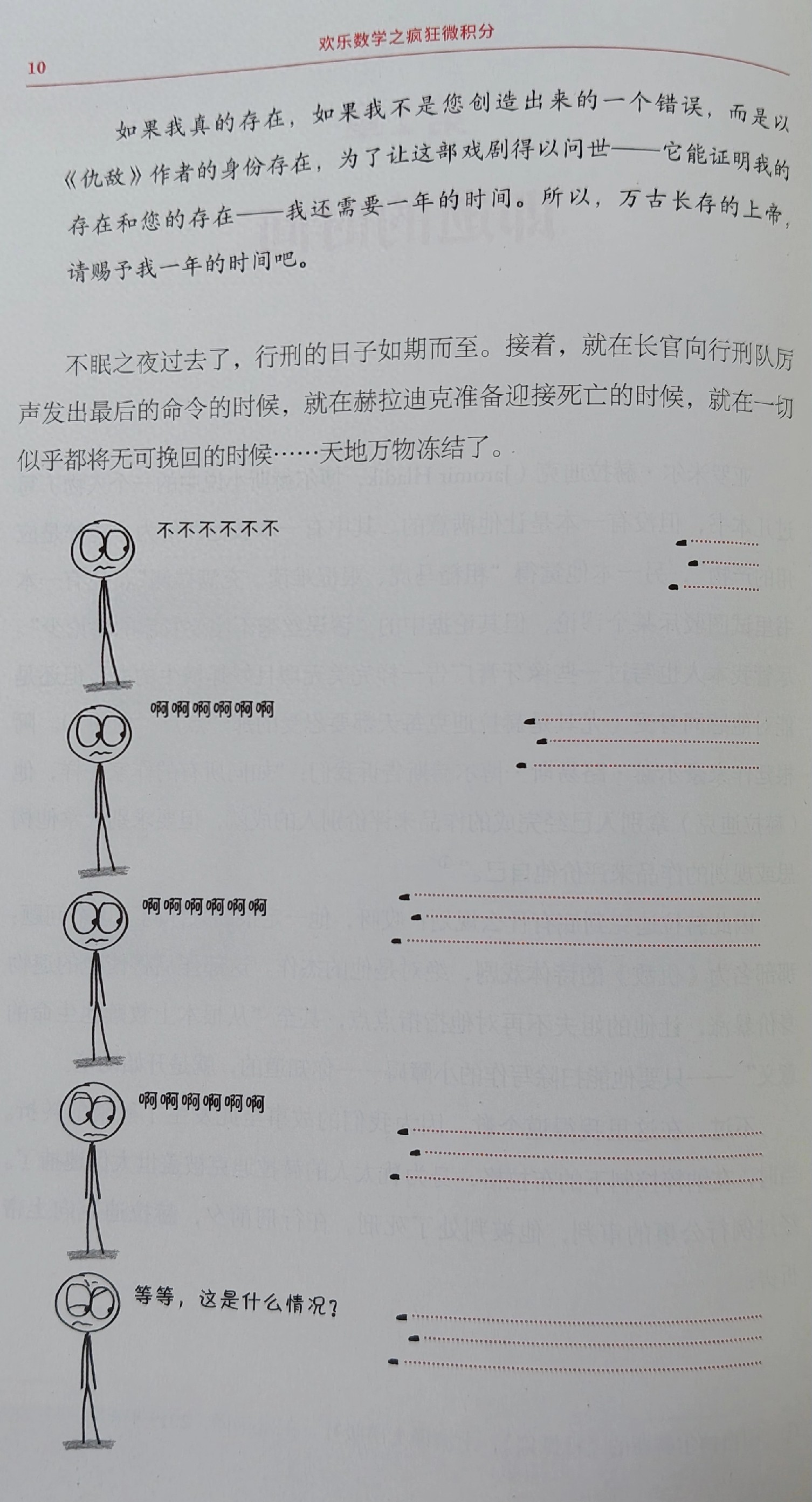 欢乐数学之疯狂微积分[美]本·奥尔林第1章即逝的时间亚罗米尔·赫拉迪克(Jaromir Hladik,博尔赫斯小说中的一个人物)写过几本书,但没有一本是让他满意的。其中有一本被他评价为“纯粹是应用的产物”,另一本他觉得“粗糙马虎、艰涩难读、充满揣测”,还有一本书里试图驳斥某个谬论,但其论据中的“谬误丝毫不比要驳斥的谬论少”。尽管我本人也写过一些像牙膏广告一样完美无瑕且妙趣横生的书,但还是能对他感同身受(尤其是赫拉迪克每天都要忍受的那一点点“伪善”)。阿根廷作家豪尔赫·路易斯·博尔赫斯告诉我们:“如同所有的作家一样,他(赫拉迪克)拿别人已经完成的作品来评价别人的成就,但要求别人拿他构思或规划的作品来评价他自己。”¹因此赫拉迪克到底有什么规划?哎呀,他一定很高兴你问了这个问题:那部名为《仇敌》的诗体戏剧,绝对是他的杰作。这部作品将使他的遗物身价暴涨,让他的姐夫不再对他指指点点,甚至“从根本上救赎他生命的意义”——只要他能扫除写作的小障碍——你知道的,就是开始动笔。不过,在这里我得道个歉,因为我们的故事至此发生了黑暗的转折。当时,在纳粹控制下的布拉格,身为犹太人的赫拉迪克被盖世太保逮捕了。经过例行公事的审判,他被判处了死刑。在行刑前夕,赫拉迪克向上帝祈祷:注¹:引自博尔赫斯的《杜撰集》,上海译文出版社,王永年译,2015年6月。如果我真的存在,如果我不是您创造出来的一个错误,而是以《仇敌》作者的身份存在,为了让这部戏剧得以问世——它能证明我的存在和您的存在——我还需要一年的时间。所以,万古长存的上帝,请赐予我一年的时间吧。不眠之夜过去了,行刑的日子如期而至。接着,就在长官向行刑队厉声发出最后的命令的时候,就在赫拉迪克准备迎接死亡的时候,就在一切似乎都将无可挽回的时候.....天地万物冻结了。