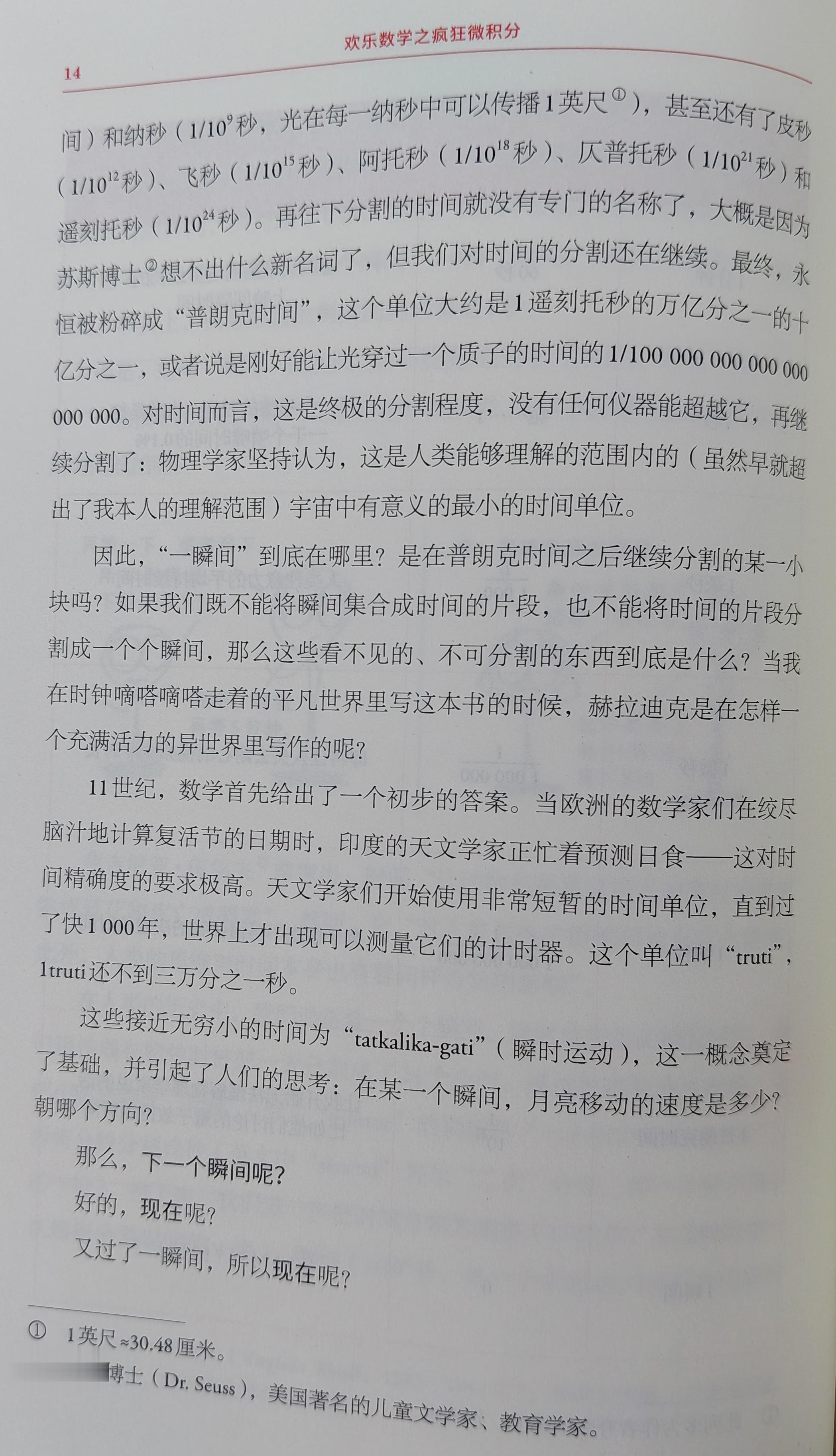中国古代的哲学家们也玩过类似的思维游戏。“无厚不可积也,”有人写道,“其大千里。”在数学层面上,一个瞬间是无量纲的:它既没有长度,也没有持续时间,只持续了0秒。但是,因为0秒的2倍仍然是0,所以2个瞬间也等于0。以此类推,10个瞬间,1000个瞬间,100万个瞬间.....都是如此。事实上,任意数量的瞬间加起来都是0秒。但是,如果“瞬间”在累积之后不能变成任何一段时间,那么“月”“年”和“一场板球比赛的时间”又是从何而来的呢?无穷小的瞬间是如何构成无穷的时间线的呢?