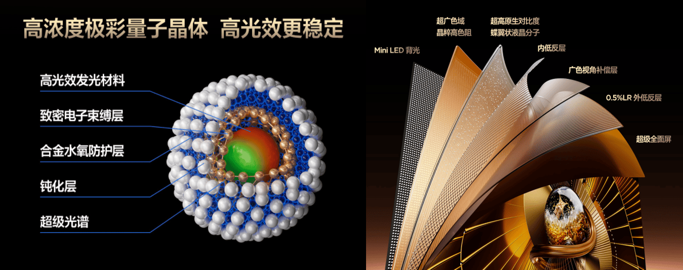 SQD-Mini LED打破十年色域僵局的关键在于凭借超级量子点材料与超级蝶翼华曜屏的黄金组合,从色彩材料到显示终端构建起全链路色彩优化体系,超级量子点的超级光谱与超级蝶翼华曜屏的穿透光谱完美匹配,实现极致的“光谱收敛”,让每种色彩都达到最精准的饱和度与还原度,从此之后肉眼可见的缤纷色彩,在电视上也能真实感受。