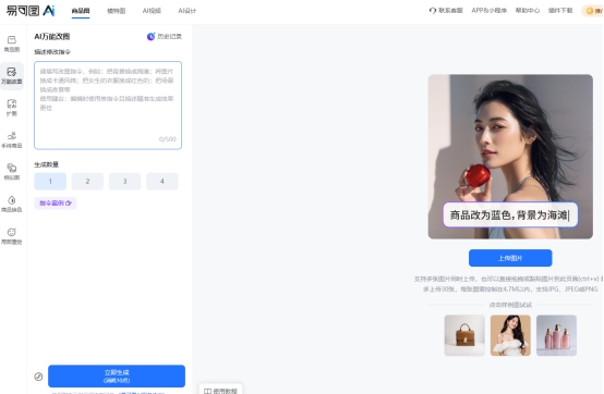 易可图的 AI 万能改图支持通过文字描述对图片进行修改,比如:调整商品颜色和材质、更换图片背景或场景、修复模糊图片,提高整体清晰度、去除水印、多余物体等。