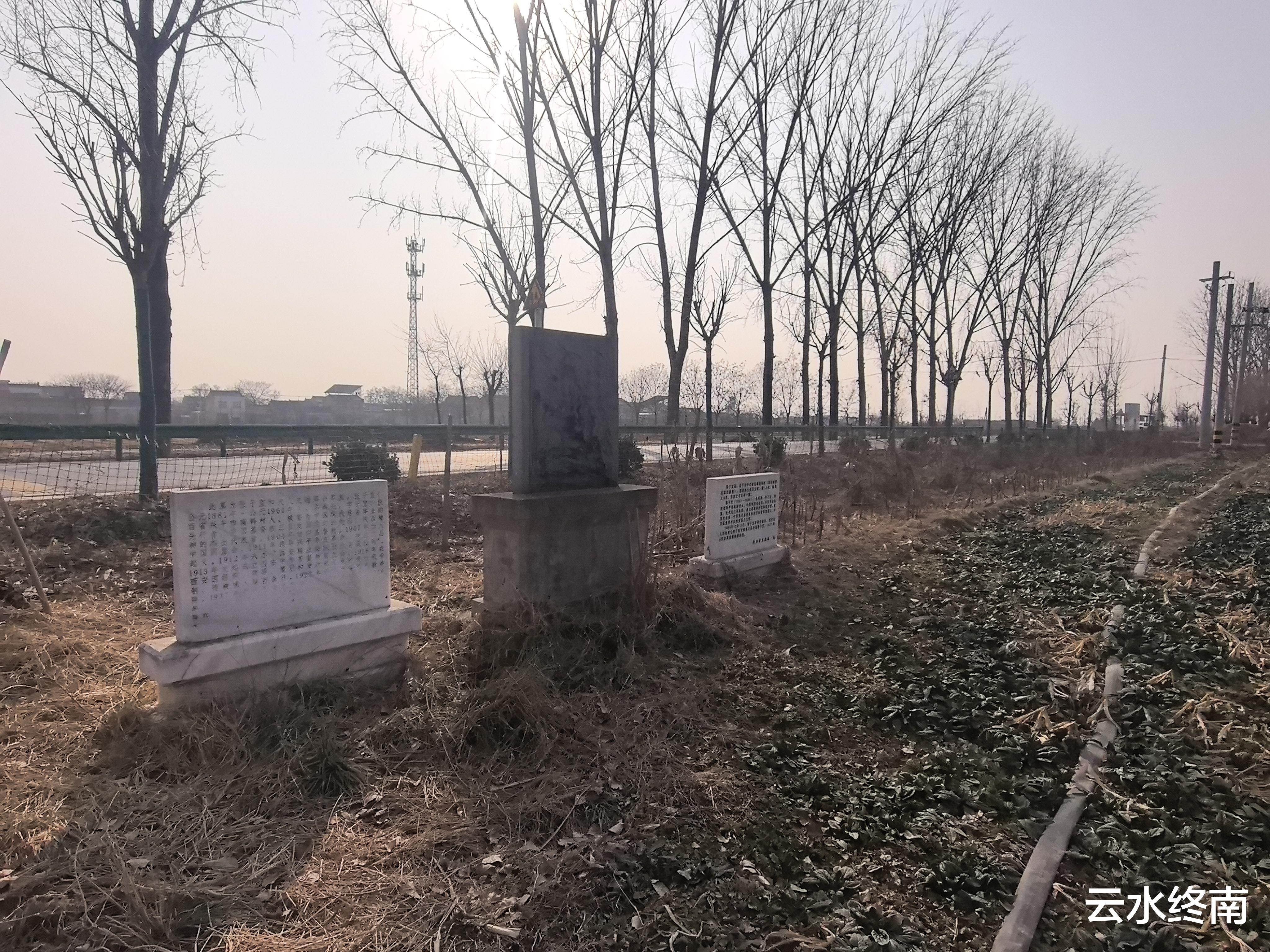 就在东西路边的庄稼地里,两块省级文保碑夹着一块方形的墓碑,除此之外,再无其他。
