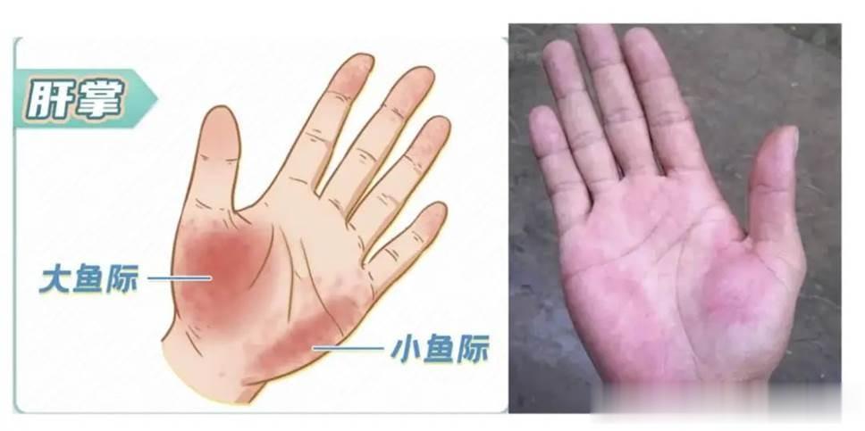 在手掌上面,有大、小鱼际(见上图)。大、小鱼际的部分如果出现红色的斑块,说明肝脏可能有问题。