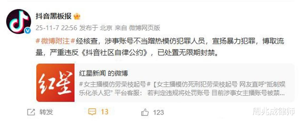 大家好,我是周兆成,今天我们就聊聊最近一抖音主播“劳枝数到三”模仿劳荣枝的操作,最后被平台无限期封禁的事。