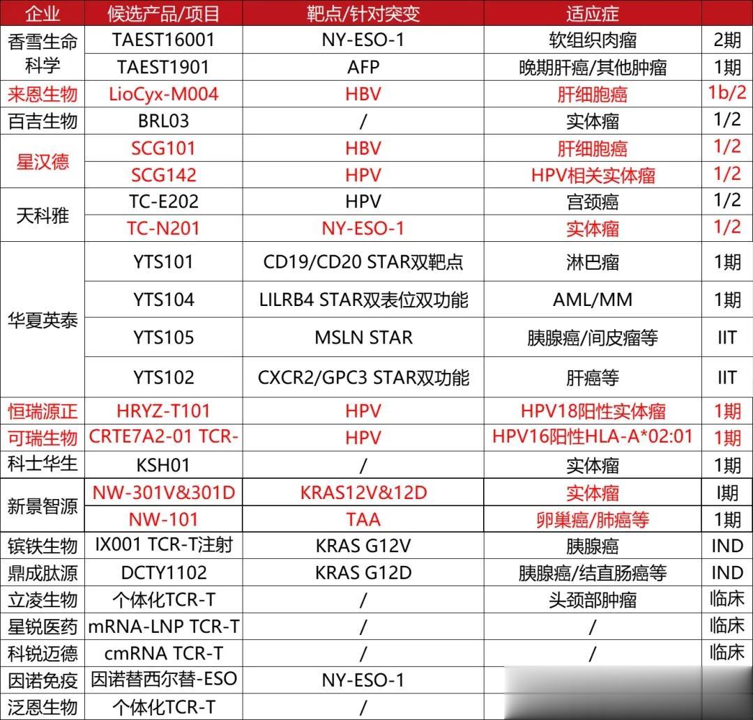 作为近年来的研究热点,TCR-T疗法目前在国内外正处于如火如荼的临床验证阶段,尤其是在实体瘤方面取得的成绩可谓是大放异彩。国内大部分企业已经进入研究者发起的临床研究(IIT)或早期临床阶段,目前最快已经推进到2期临床阶段。在适应症方面,针对肝癌、宫颈癌、软组织肉瘤的产品较多。对于实体瘤领域,TCR-T疗法挑战与机遇并存。