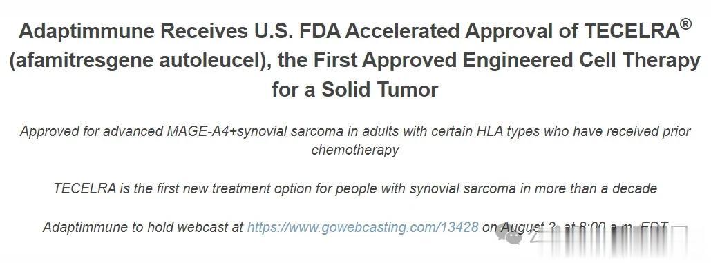 官宣!全球首款TCR-T细胞疗法获FDA批准上市!