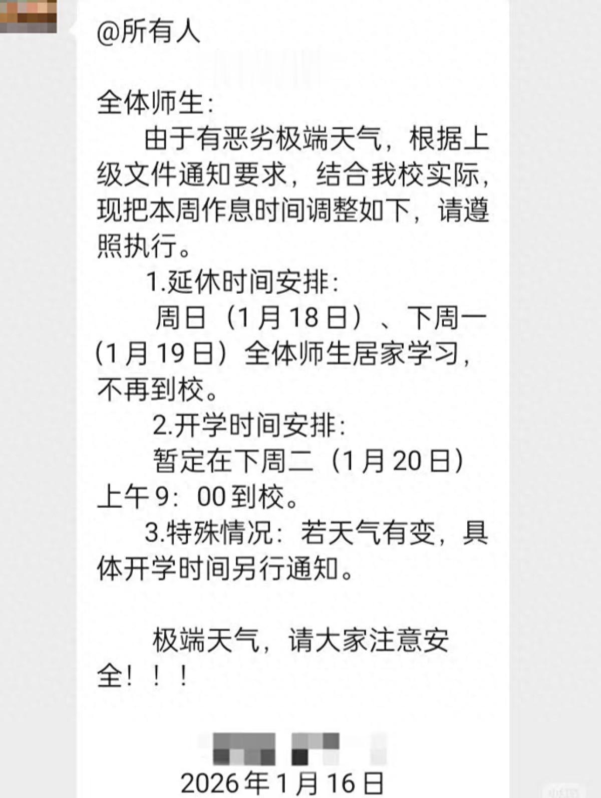 其中,多所幼儿园及义务教育阶段学校明确,1月19日(下周一)全天停课,所有线下教学活动暂停。而部分普通高中则采取了对等时间调休,即利用本周末(1月17日至18日)提前上课,将下周一、周二的课程提前消化,确保在雨雪最强的时段让学生留在家中休息。