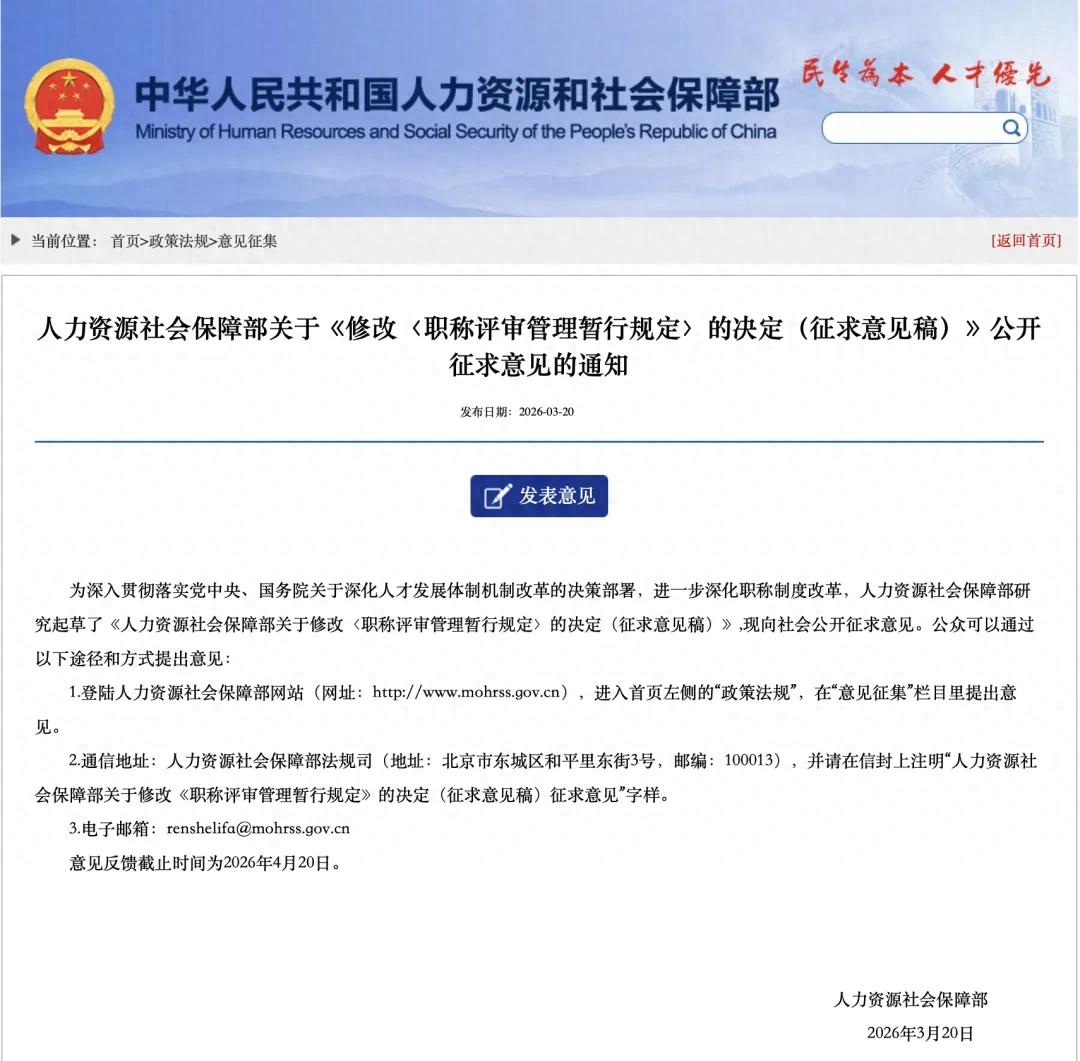 3月20日,人力资源和社会保障部研究起草了《人力资源社会保障部关于修改〈职称评审管理暂行规定〉的决定(征求意见稿)》(以下简称《征求意见稿》),向社会公开征求意见,意见反馈截止时间为2026年4月20日。