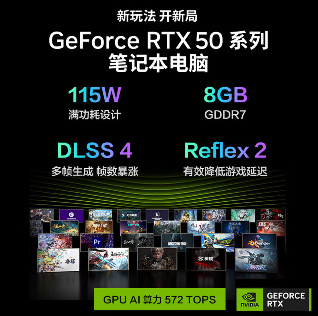 与之搭档的,是满功耗版的RTX 5060 笔记本电脑 GPU。这款基于NVIDIA Blackwell架构的显卡,配备了3328个CUDA核心与8GB GDDR7显存,并支持DLSS 4.5和Reflex 2技术。从《黑神话:悟空》中光影复杂的场景,到《无畏契约》里需要快速反应的激烈对抗,这套处理器与显卡的组合都能提供流畅顺滑的视觉保障。