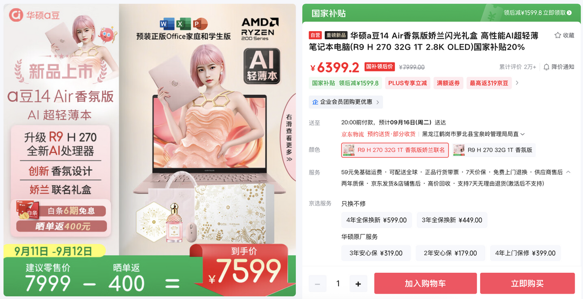 华硕a豆14 Air 香氛版高颜高能、AI加持还有独特香氛体验,不仅是出色的生产力工具,更是你的情绪调节器、生活艺术品。现在购买华硕a豆|法国娇兰 闪光礼盒,部分地区可领取至高20%国家补贴,加上晒单返400元福利,到手价6399.2元(国补地区详情可咨询客服了解),咨询客服还可领取一年香片替换装(30片)。而且你还能免费享受a豆无忧服务计划,包括2年硬件上门服务、2年无限远程协助、2年好屏无忧换新、2年整机国际联保,入手更安心。