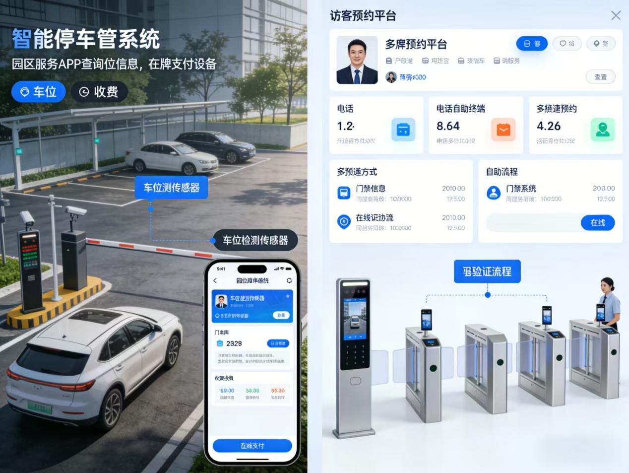 (2)访客预约平台搭建多渠道访客预约平台,支持电话预约、自助终端预约和在线预约等多种方式。访客预约信息与门禁系统联动,实现访客身份的快速验证和通行权限的自动分配,提升园区的访客管理效率和服务水平。