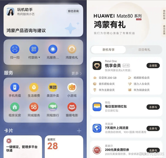 很多朋友买了新机容易忽略这个,所以我必须强烈安利:只需在桌面右滑到负一屏,点击“鸿蒙有礼”进入活动页面,就能直接领到6个月的Petal One悦享套餐。要知道,这可是包含了华为音乐、视频、云空间等六大权益的“全家桶”。