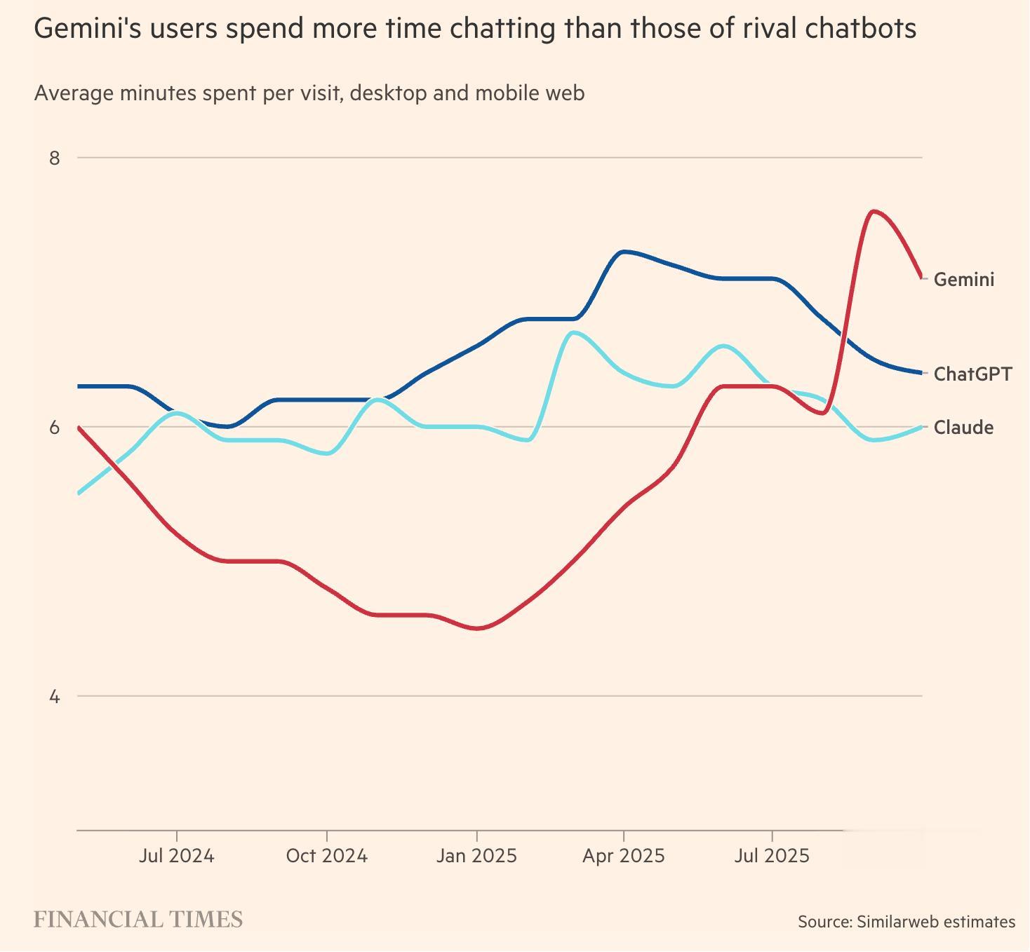 在数据方面,今年9月,Gemini App的月活跃用户达到7.8亿,较5月的2亿月活跃用户增长了290%,正逼近ChatGPT的月活跃用户数;在用户每次与AI对话的平均时长对比中,Gemini已领先于ChatGPT。