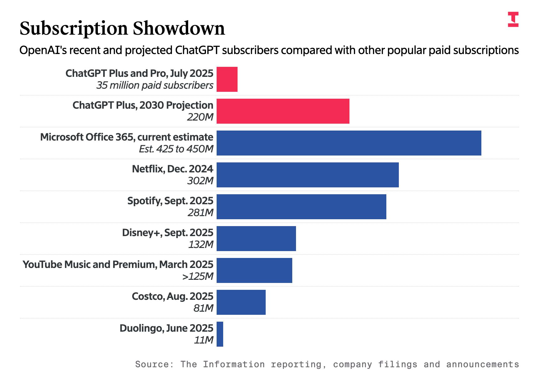 OpenAI近期及2030年预测付费用户数与其他企业近期付费用户数对比(来源:The Information)
