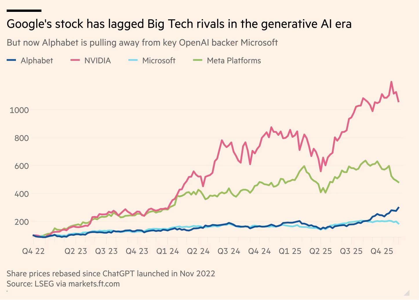 谷歌母公司Alphabet的股价正逐渐超越OpenAI的有力支持者微软