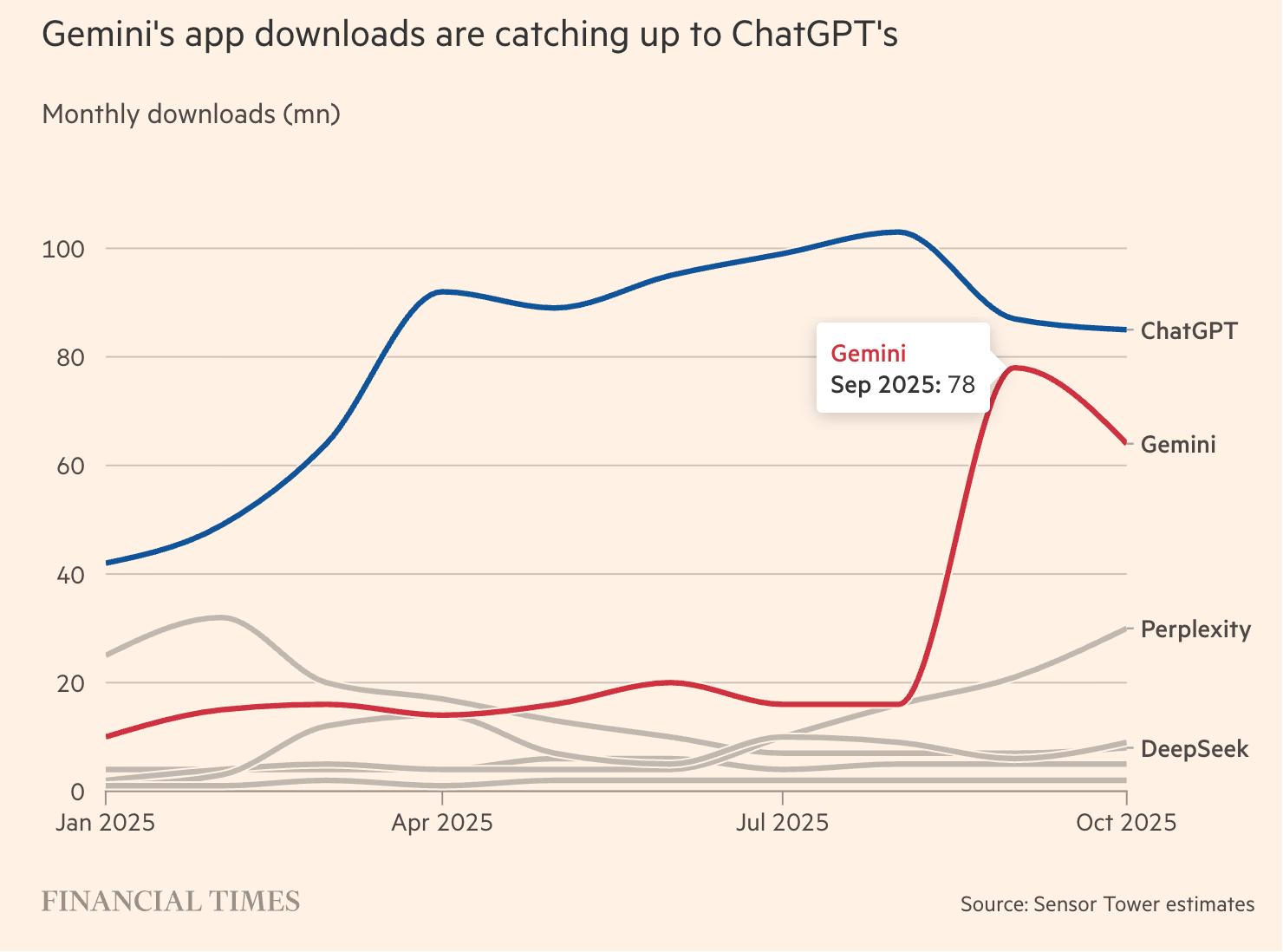 第一,Gemini App的下载量正逐步上升并追赶ChatGPT。全球知名移动应用数据分析公司Sensor Tower的最新数据显示,9月Gemini App的月活跃用户数达到7.8亿,较5月的2亿月活跃用户增长了290%,10月Gemini App的月活跃用户数为6.5亿,较5月增长了225%。