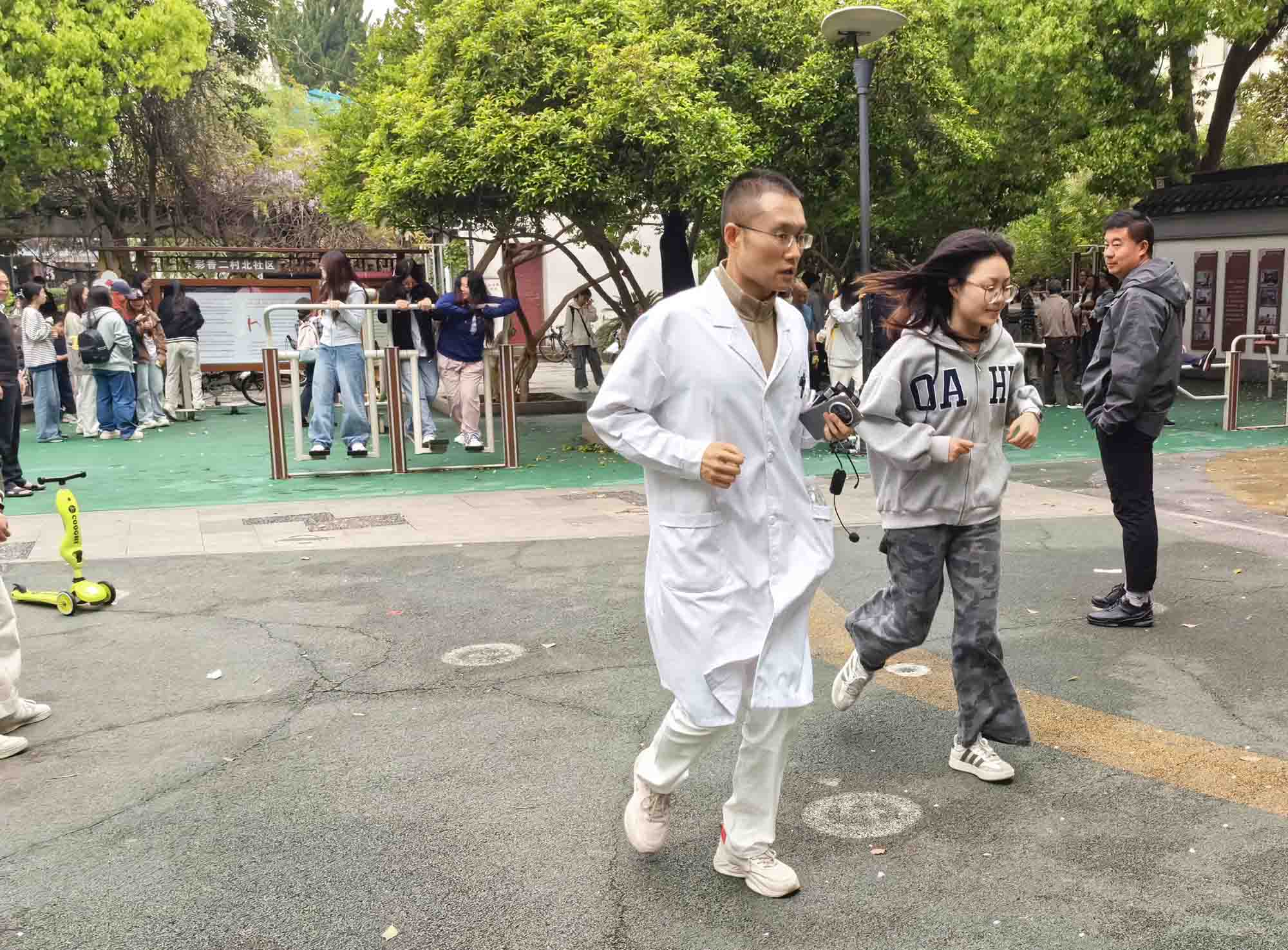 课程结束后,学生们还参观了彩香二村北社区、彩香综合为老服务中心、老年人运动中心及彩香二村社区卫生服务站,实地了解基层在老年人健康管理、慢性病防控及康复运动服务等方面的运行模式。在彩香二村公园的运动区内,学生们与正在锻炼的老人和孩子们进行了亲切交流和互动,主动询问他们的日常运动习惯,分享科学运动的小知识,并和老人们一起运动。同时,学生们还进行了慢跑练习,老师现场纠正动作,讲解心率自测与主观疲劳评估方法,帮助学生在真实环境中掌握科学慢跑的核心要领。欢声笑语中,学生们将课堂所学转化为服务社区的实际行动,也收获了来自“一老一小”群体的真诚点赞。