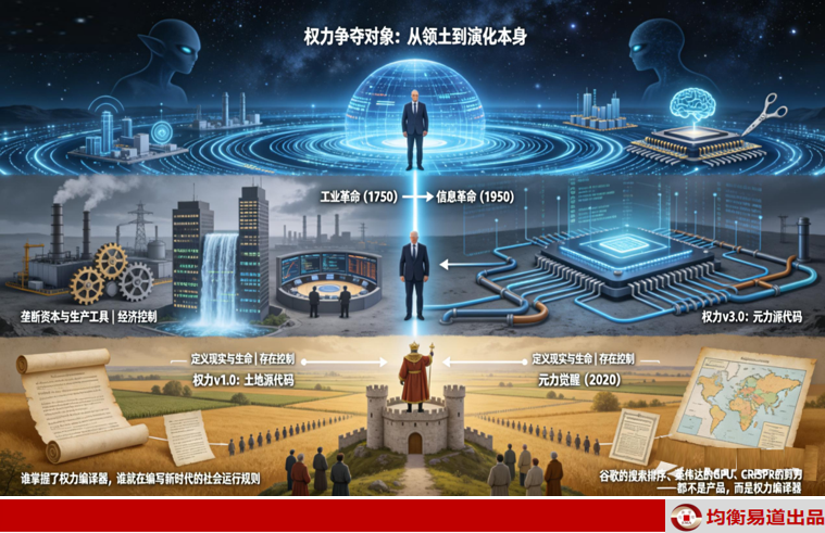 权力将完成它的三次跃迁。农业时代,其源代码是 “对土地与人口的占有”,表现为疆域与贡赋。工业时代,它升级为对资本与生产工具的垄断”,体现为工厂与金融网络。而在我们正坠入的数智纪元,权力的终极形态坍缩为“对数据流的捕获、对智能算法的设计、对算力的独占,以及对生命代码的编辑权”。谷歌的搜索排序、英伟达的GPU架构、CRISPR的基因剪刀,这些都不是产品,而是“权力编译器”。谁掌握了它们,谁就在编写新时代的社会运行规则。