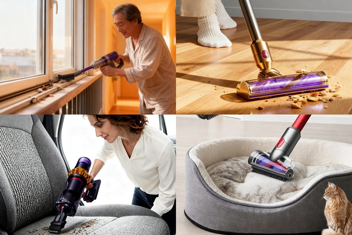 优先选择刷头多样且容易拆洗的吸尘器。地刷拿下地板和地毯;部分机型配宠物梳理刷专门对付浮毛;再用缝隙刷,窄位与角落的旧灰可直接清除。