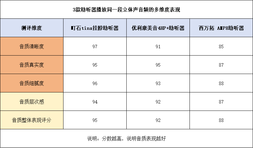 测评方法:本次测试,我播放了同一段立体声音频,重点关注三款助听器在音质清晰度、真实度、细腻度和层次感方面的表现,然后对维度进行评分。