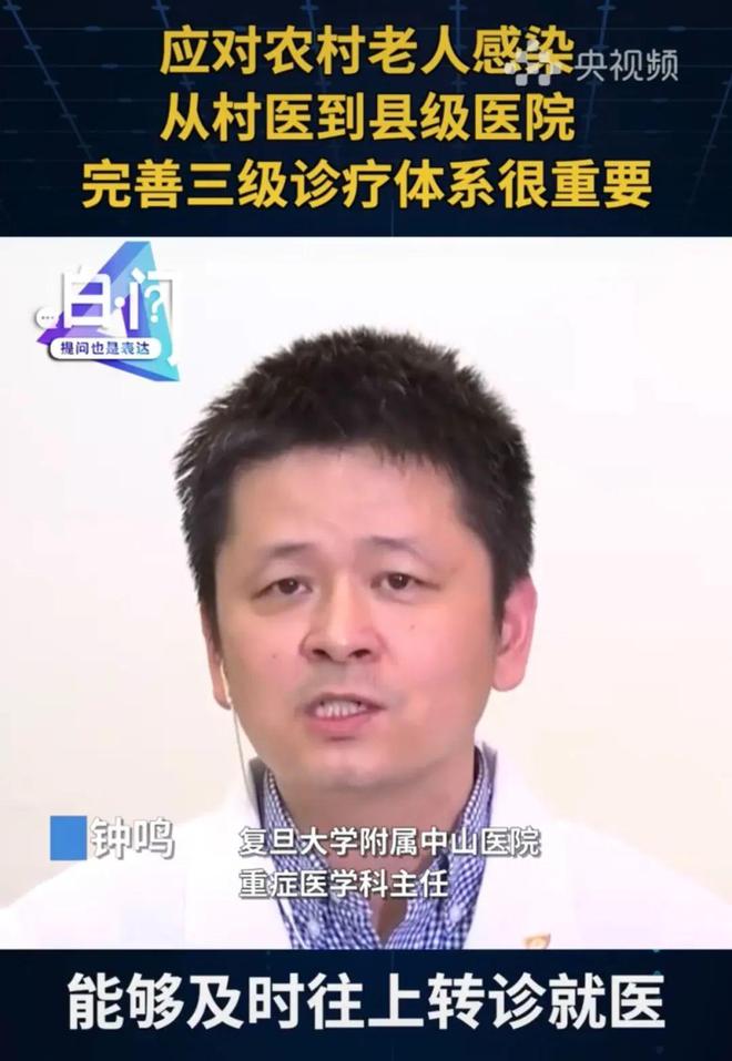 复旦大学附属中山医院重症医学科主任钟鸣医生提出,应对农村老人感染,最需要的是完善三级诊疗体系。
