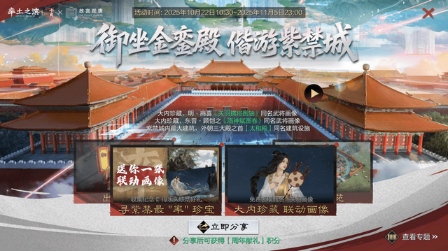 金瓦朱墙拔地而起,昔日皇权的象征如今成为每位玩家主城中心可触摸的文化地标,大家仅需要通过参与“寻紫禁最率珍宝”集卡活动,完成日常任务即可免费领取、永久保留!