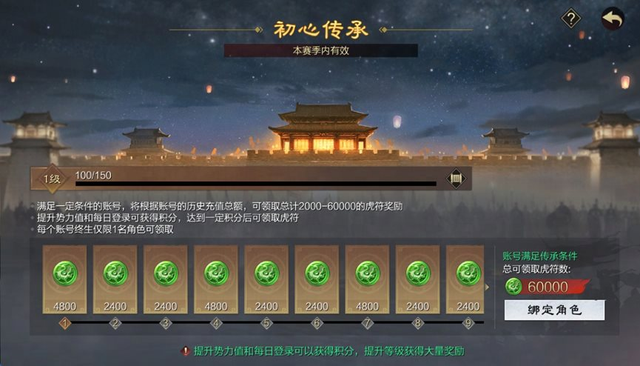 进入玉玺联动主题服的玩家,还能参与“初心传承”活动,免费保底获得2000虎符,最高60000虎符,最快一周内即可拿满全部奖励。