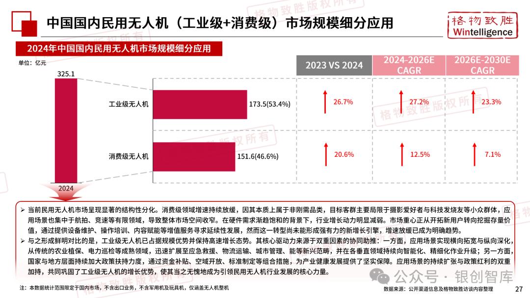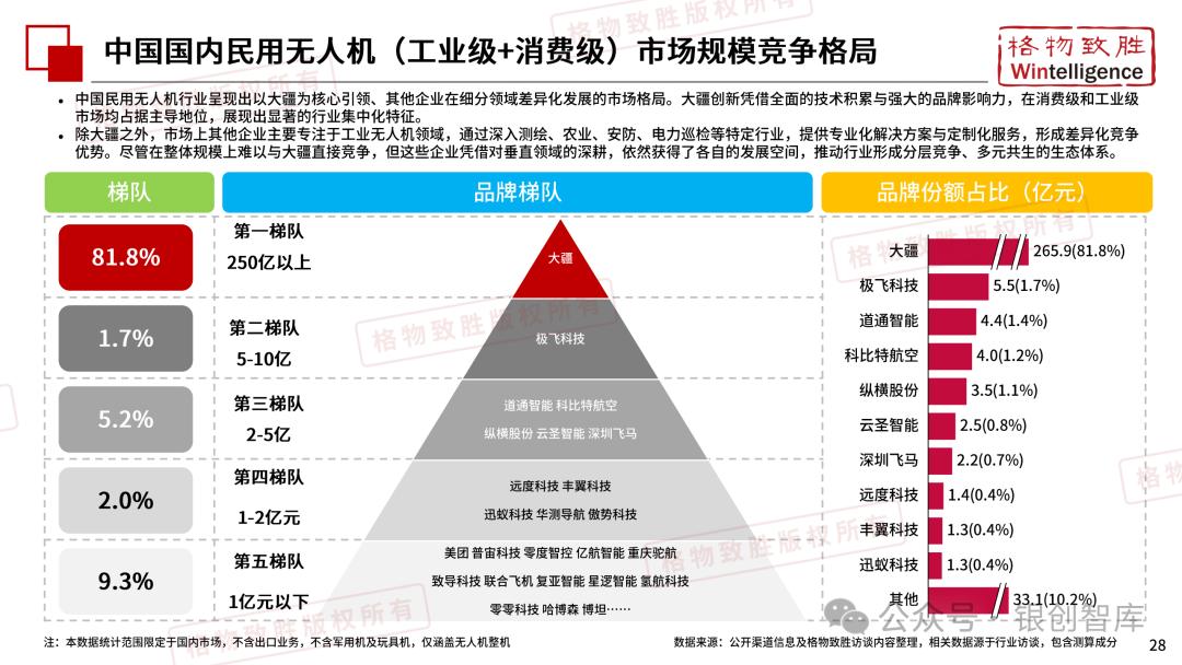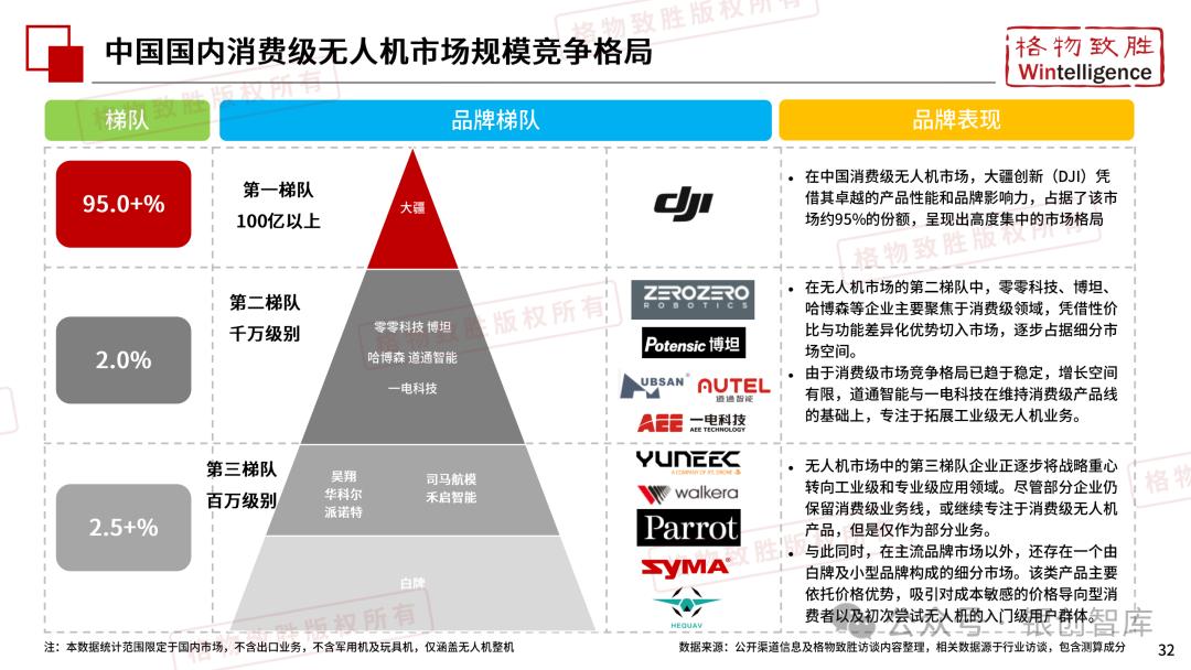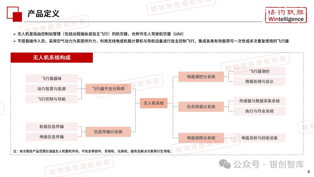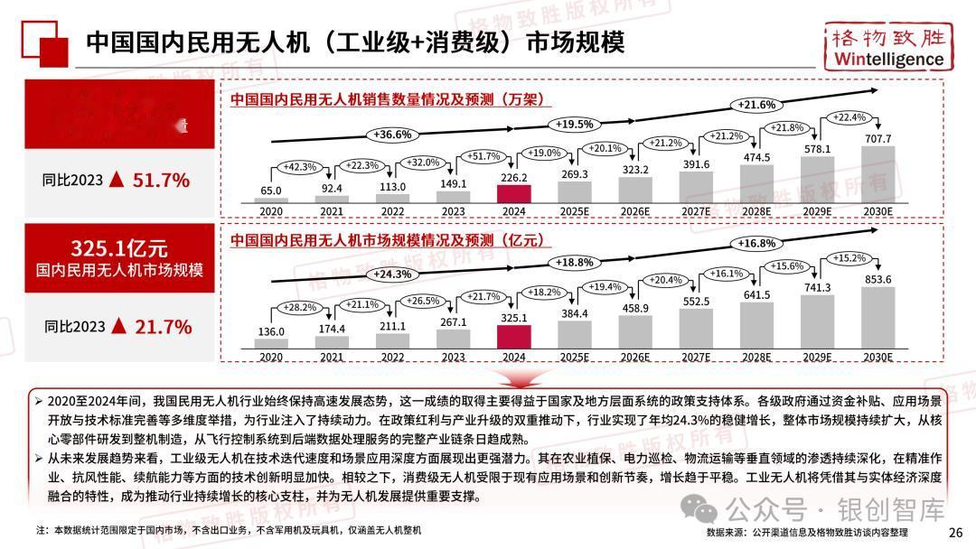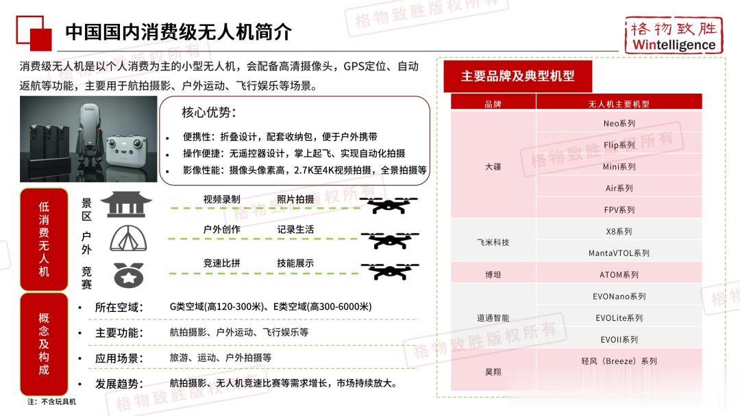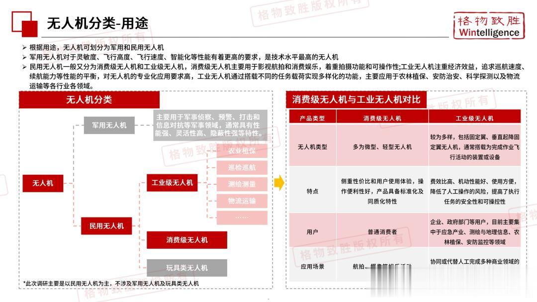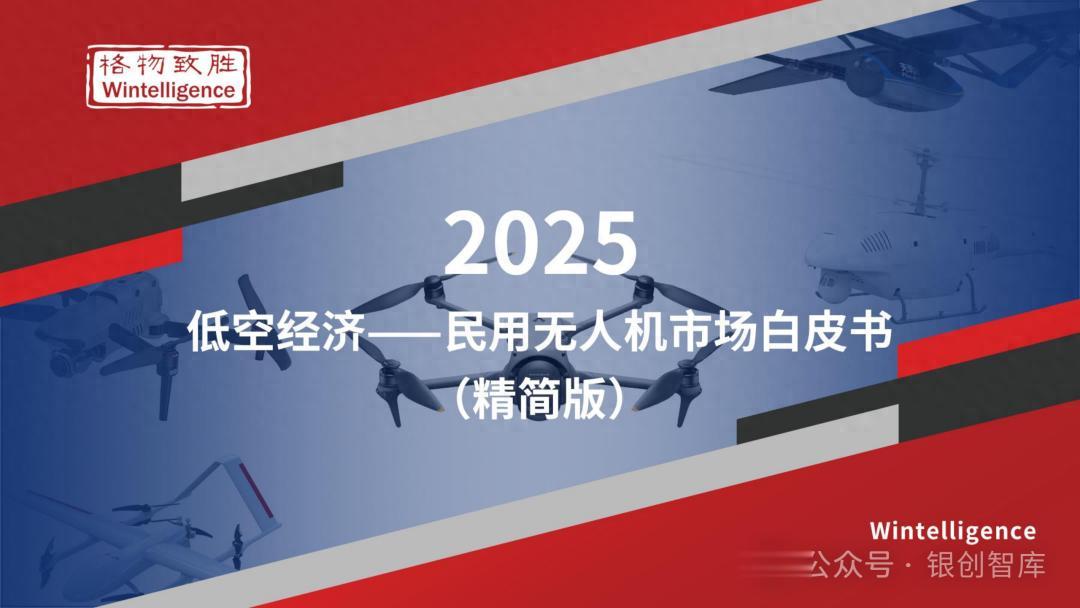 本白皮书由格物致胜(Wintelligence)编制,聚焦中国民用无人机市场(不含军用及玩具类产品),系统梳理产业政策、技术演进、市场格局与应用趋势。内容涵盖消费级无人机的市场主导格局、工业级无人机的规模化落地路径,尤其关注农业植保等成熟场景的发展现状,以及中高端机型的技术突破方向。