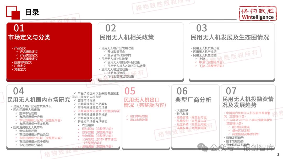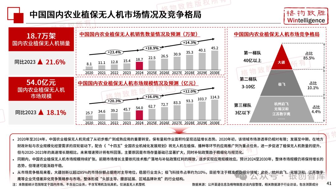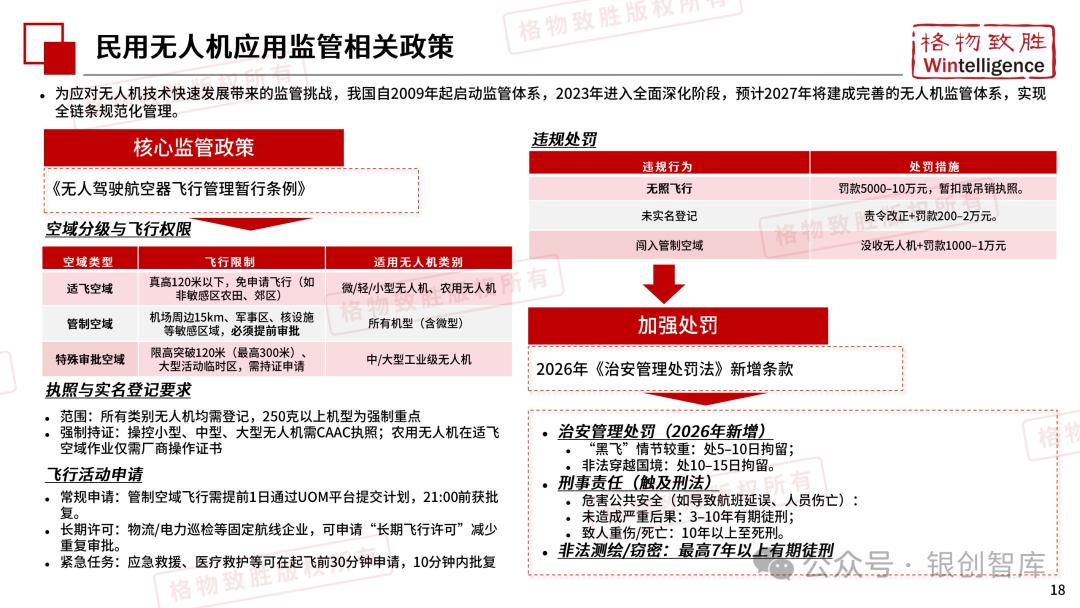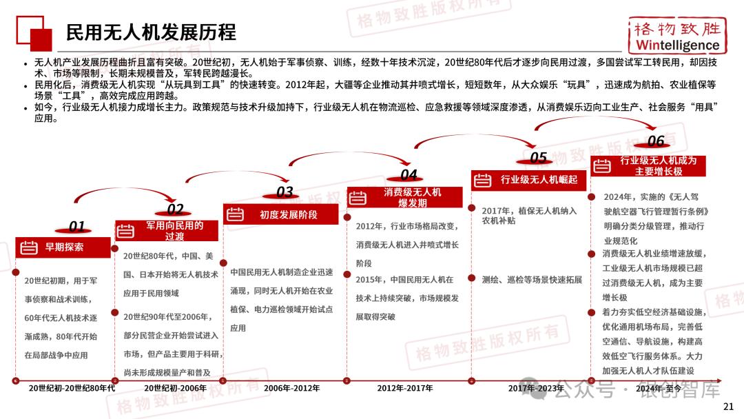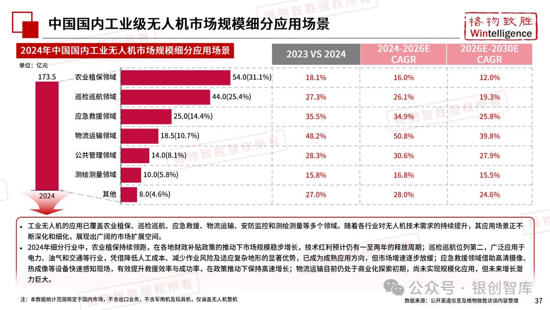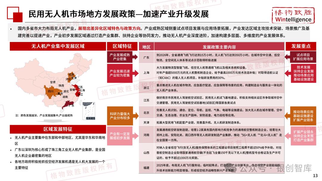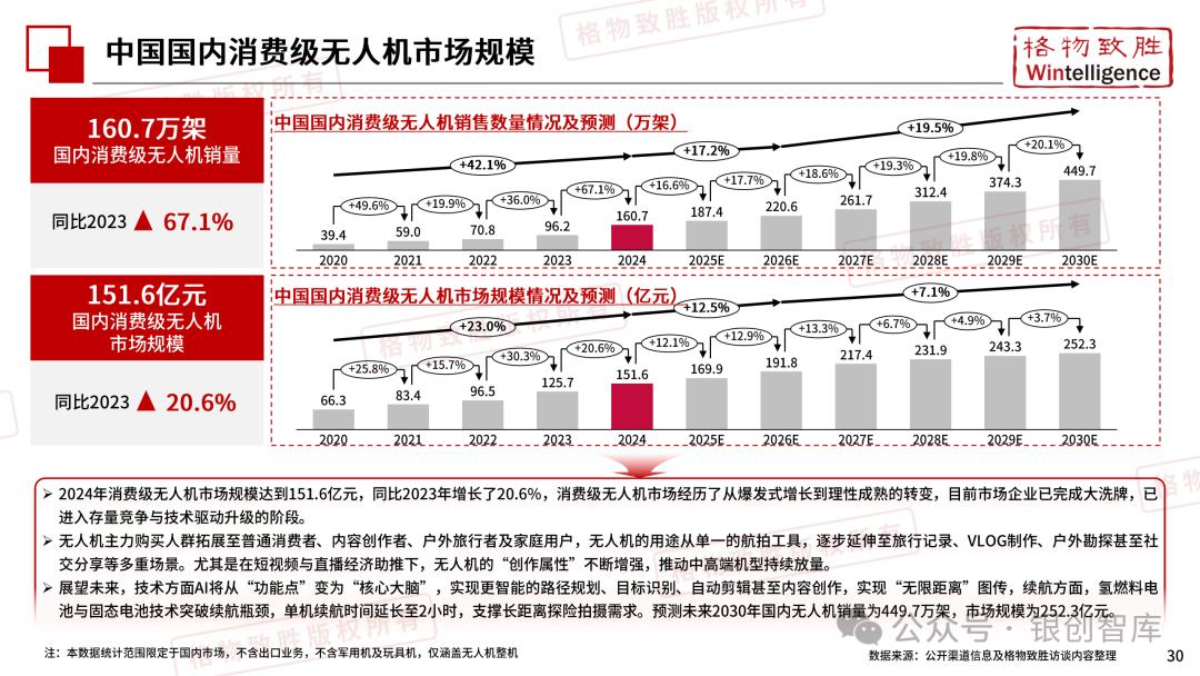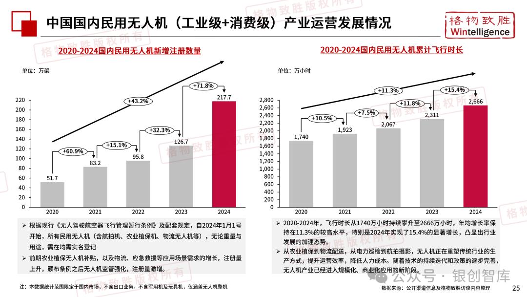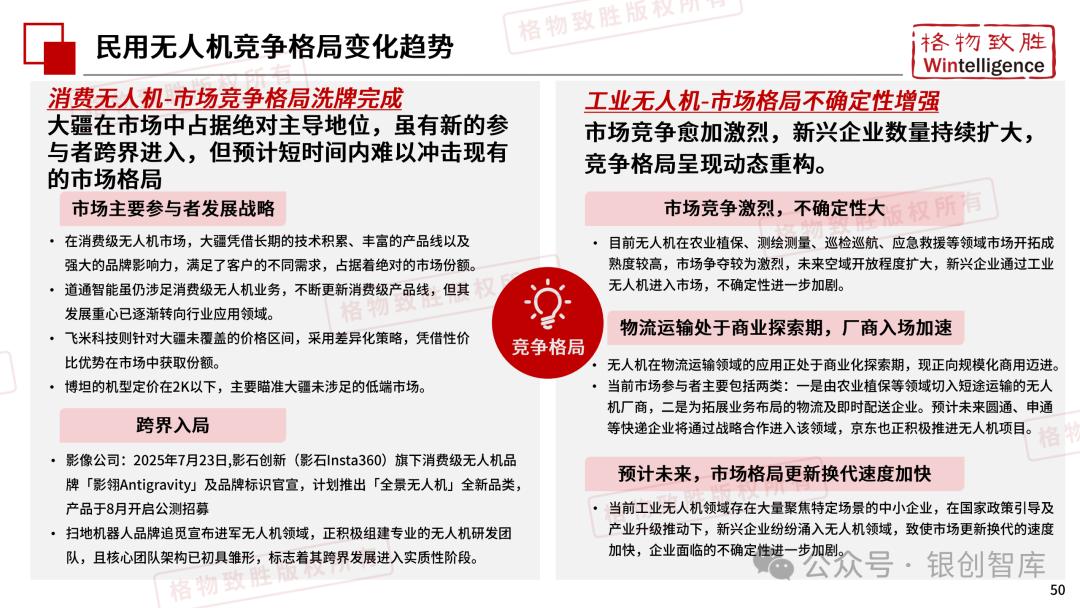 本白皮书由格物致胜(Wintelligence)编制,聚焦中国民用无人机市场(不含军用及玩具类产品),系统梳理产业政策、技术演进、市场格局与应用趋势。内容涵盖消费级无人机的市场主导格局、工业级无人机的规模化落地路径,尤其关注农业植保等成熟场景的发展现状,以及中高端机型的技术突破方向。