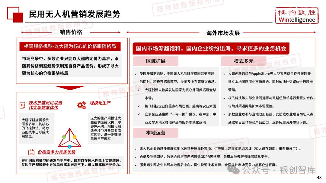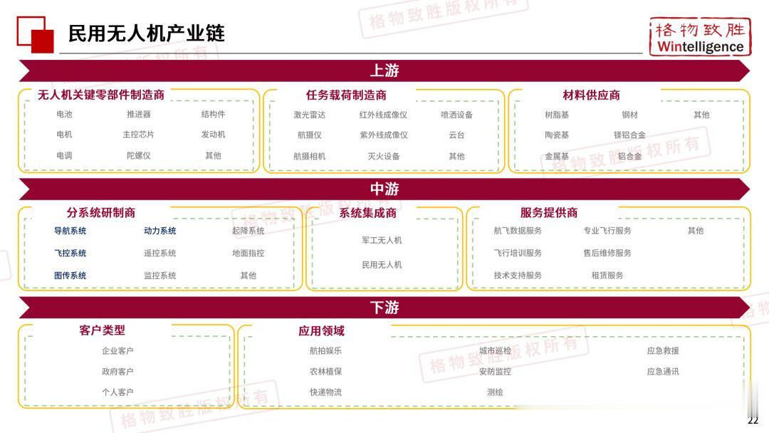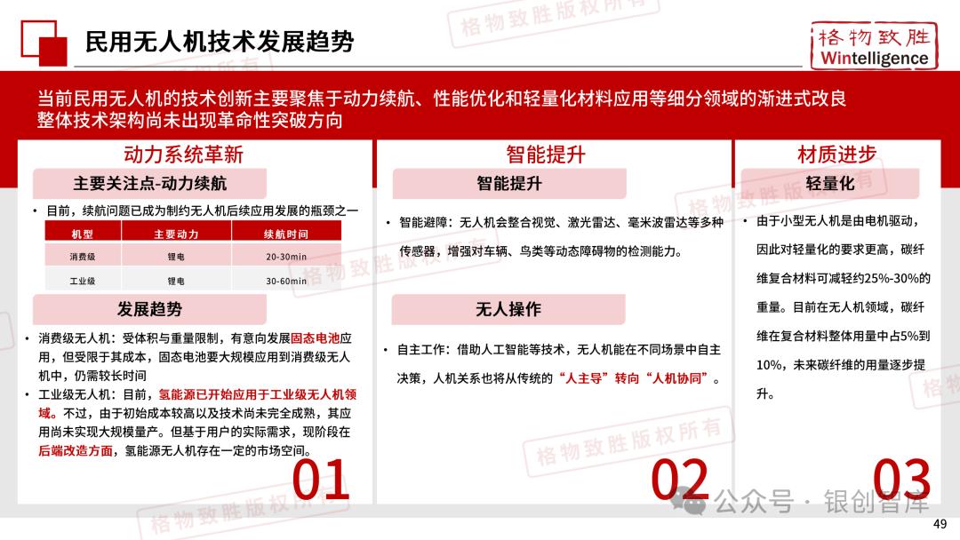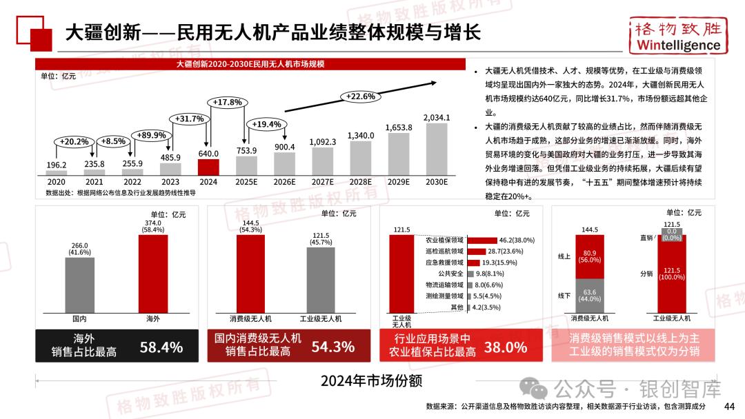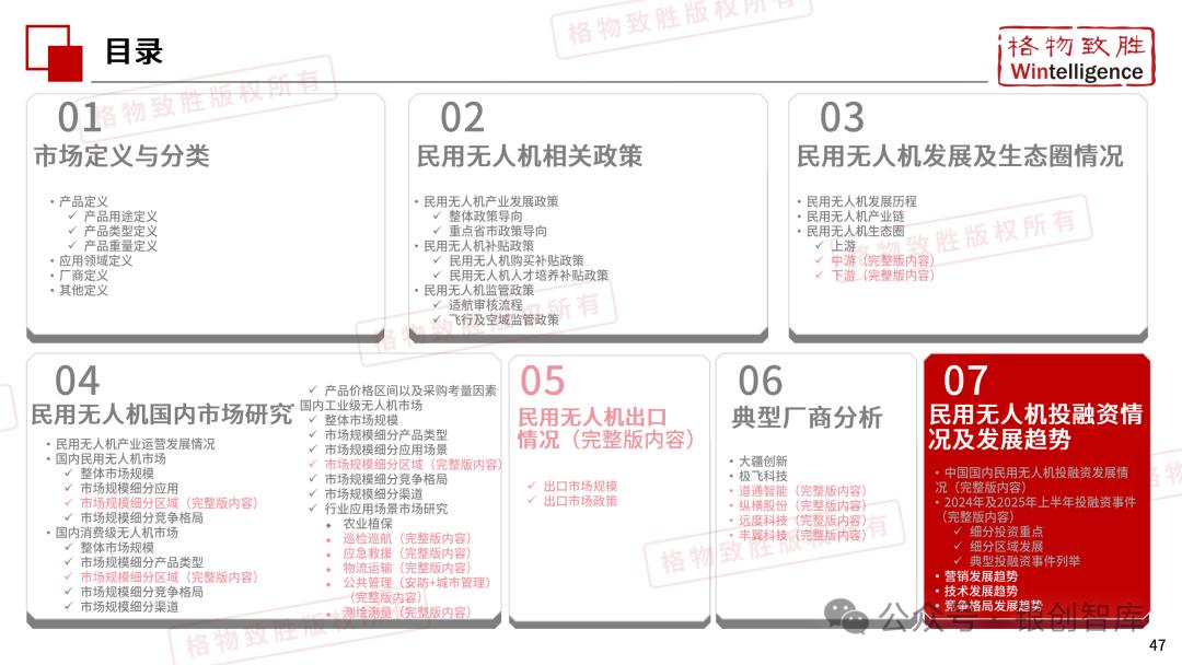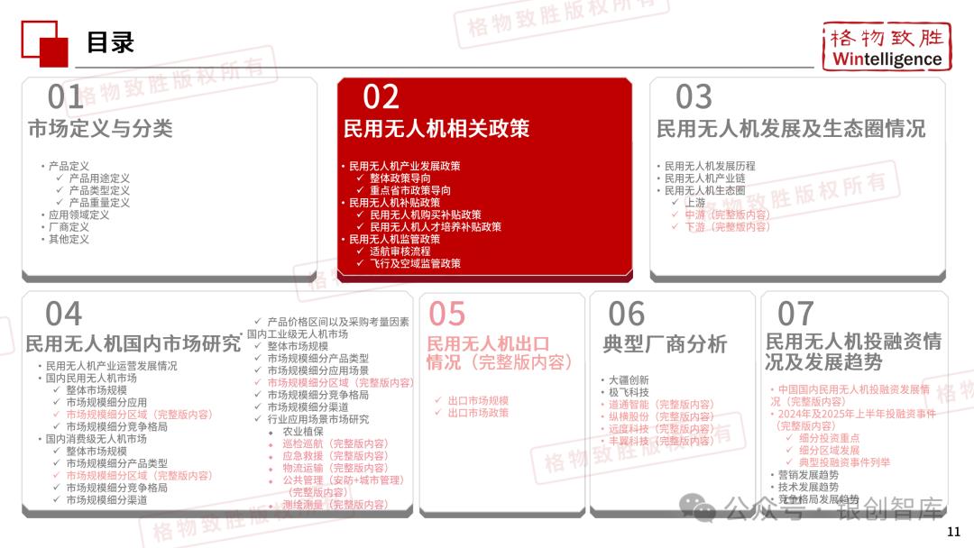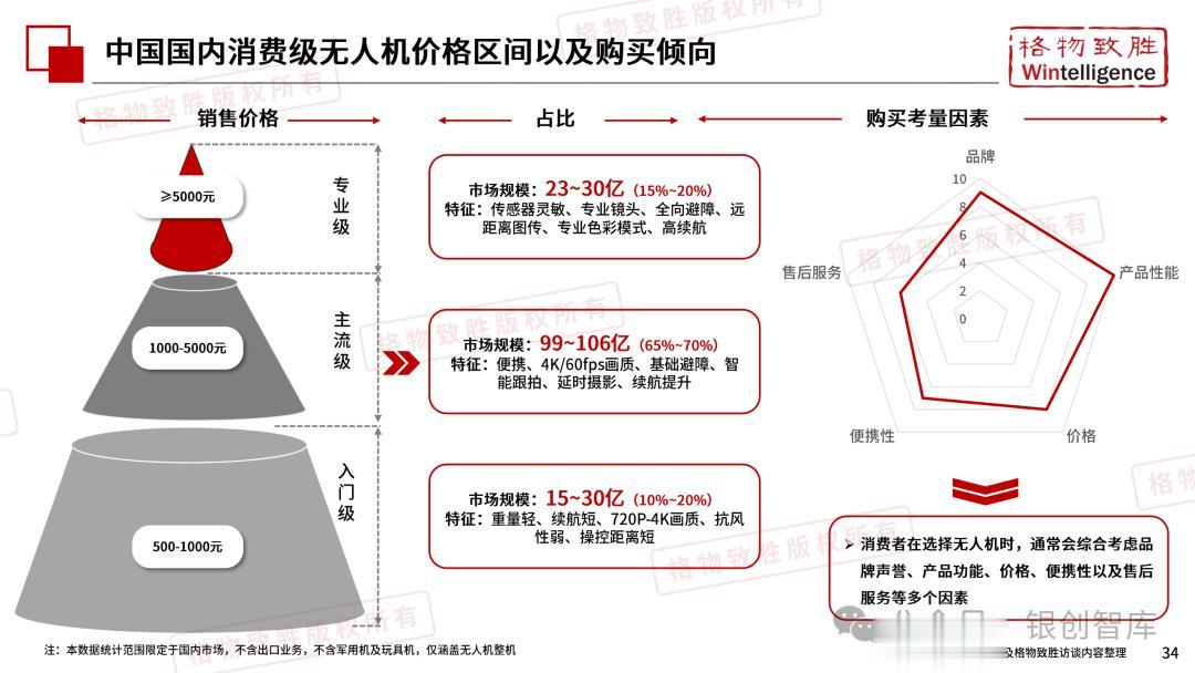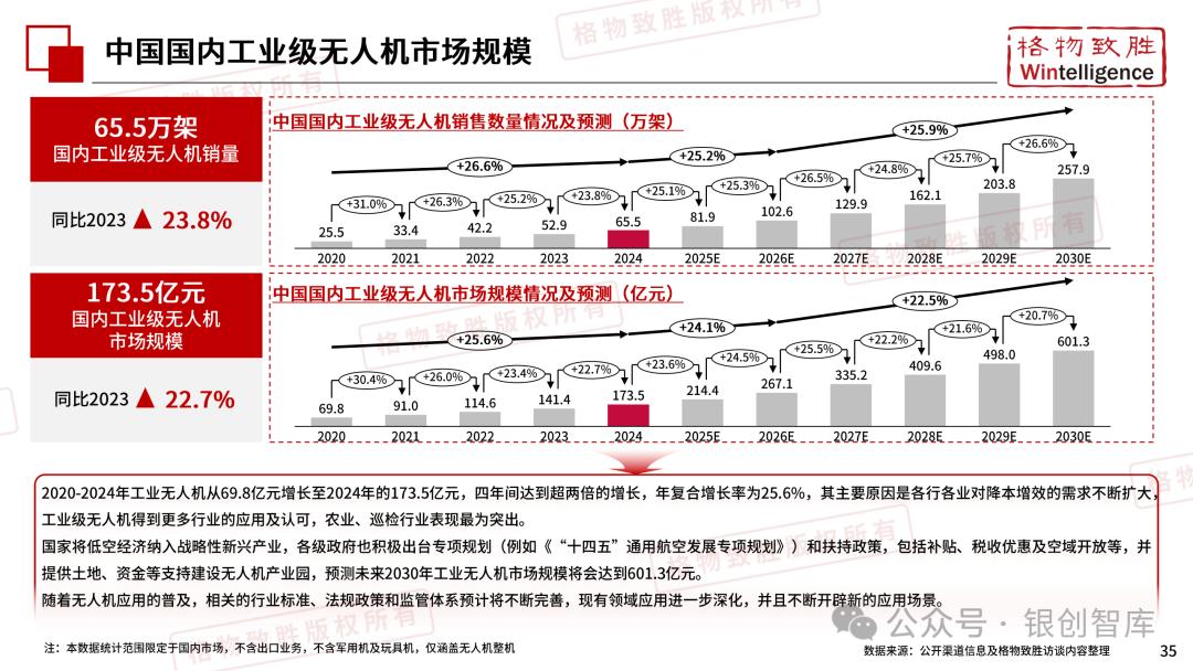 本白皮书由格物致胜(Wintelligence)编制,聚焦中国民用无人机市场(不含军用及玩具类产品),系统梳理产业政策、技术演进、市场格局与应用趋势。内容涵盖消费级无人机的市场主导格局、工业级无人机的规模化落地路径,尤其关注农业植保等成熟场景的发展现状,以及中高端机型的技术突破方向。