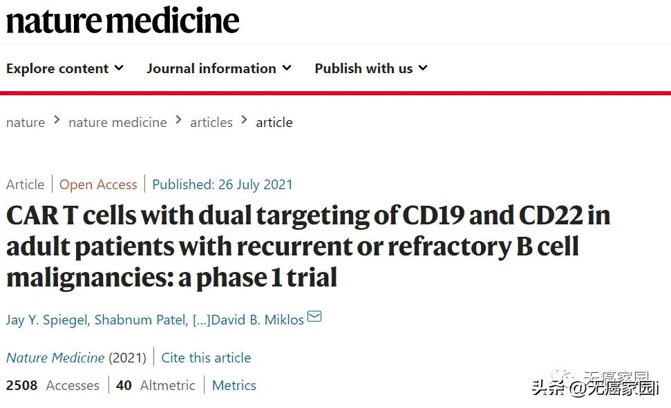 2021年7月26日,著名国外医学杂志《Nature Medicine》上刊登了关于双特异性靶点CD22-CD19-CAR-T细胞疗法的最新治疗数据!效果着实亮眼!