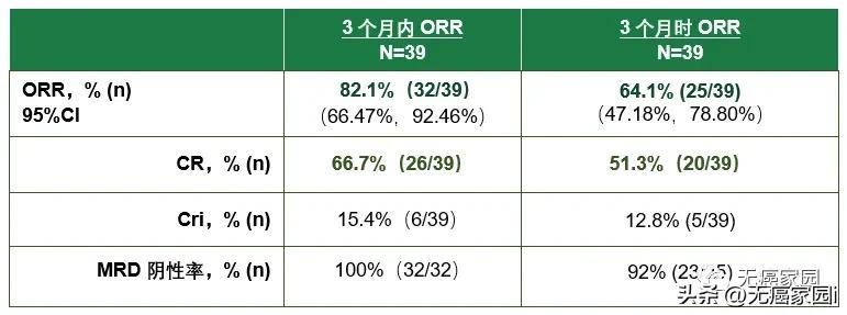 3个月内的总体缓解率(ORR)高:在39例患者中,有32例患者达到不同程度的缓解,3个月内的ORR为82.1%!3个月时的总体缓解率(ORR)高:在39例患者中,经IRC评估有25例患者达到不同程度缓解,3个月时的ORR为64.1%。CR(完全缓解)率高:32例3个月内获得ORR的患者中,26例为CR,CR率达66.7%(26/39)。25例3个月时获得ORR的患者中,20例为CR,CR率达51.3%(20/39)。MRD阴性率高:3个月时和3个月内达CR或CRi患者中MRD阴性率分别为92.0%和100%。